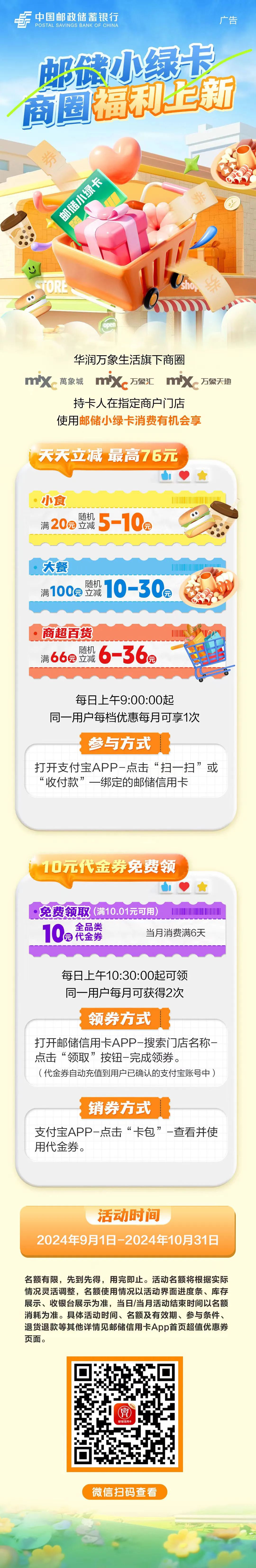 【天天秒杀】邮储支付节,1分抢购6元微信立减金!