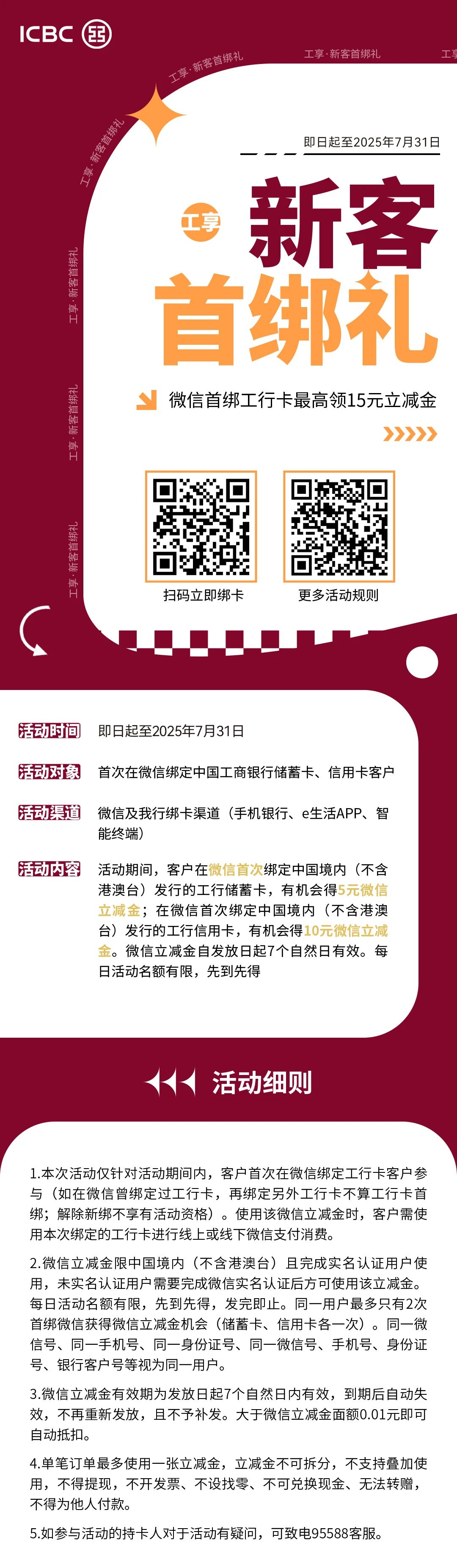 【微信首绑礼】微信首绑工行卡最高领15元微信立减金! -凯发k8娱乐官网app下载