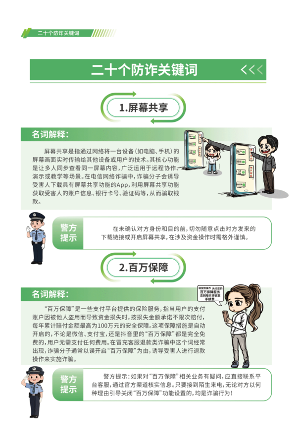 为深入学习贯彻习近平总书记关于打击治理电信网络诈骗犯罪的重要指示精神,落实国务院重大决策部署及人民银行有关工作要求,促进行业提升风险防控水平,助力更高水平的平安中国建设,交通银行积极转发由公安部刑侦局总结提炼的20个电诈关键词(包括“屏幕共享”“百万保障”“安全账户”“nfc盗刷”等典型诈骗手法)进行风险提示,旨在引导人民群众正确认识和防范电信网络诈骗风险,牢牢守护人民群众的“钱袋子”安全。 左右滑动查看二十个防诈关键词 ![]() 下一篇: 交通银行亮相2025世界人工智能大会