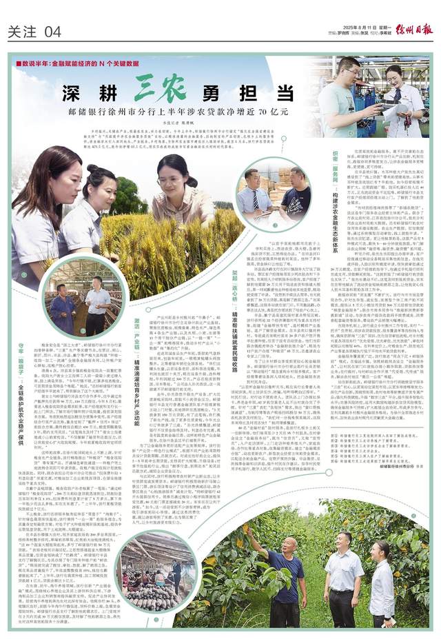 ![]() 乡村振兴,关键在产业,根基在农业,动力在创新。今年上半年,邮储银行徐州市分行锚定“强化农业强省建设金融支持”与“巩固提升涉农金融服务质效”目标,以精准滴灌的金融服务、因地制宜的产品创新、扎根乡土的服务情怀,将金融活水引入田间地头、产业链条、乡村角落,为徐州农业强市建设注入强劲动能。截至6月末,该行涉农贷款余额达429.5亿元,较年初净增69.1亿元,用实实在在的成效书写着金融助农兴村的时代答卷。 守牢粮袋子:全链条护航农业稳产保供 粮食安全是“国之大者”。邮储银行徐州市分行紧扣春耕备耕、“三夏”生产等关键节点,在贾汪、铜山、新沂、邳州、丰县、沛县、睢宁等产粮大县构建“种植—收购—加工—流通”全链条金融服务网,让种粮户安心耕耘、收粮户放心经营。 清晨6点,沛县某乡镇的粮食收购点一派繁忙景象。收购大户谢女士正指挥工人将一袋袋小麦过磅入库,脸上满是笑容。“今年行情不错,打算多收些粮食,可前期资金周转是个难题。”她说,“还好邮储银行的客户经理早早就来了,帮我解决了这个大麻烦。” 谢女士与邮储银行沛县支行合作多年,往年通过房产抵押先后获得90万元、110万元授信。今年5月初,眼看进入粮食收购资金需求旺季,客户经理就和支行长一起上门拜访,了解市场行情和预计收购量,提前谋划服务方案。考虑到她想追加授信方便集中使用,客户经理结合行里产品优势,量身定制了“抵押 信用 保证”的组合方案,最终授信总额达430万元,额度期限最低3年,期内支用灵活。“这笔钱太及时了!”谢女士指着堆成小山的麦粒说,“不仅缓解了融资和还款压力,还让我能安心扩大收购规模,今年的夏粮收购肯定顺顺利利。” 这样的故事,在徐州的田间地头上不断上演。针对粮食生产全链条,该行精准推出“种粮贷”“粮食收购贷”等专属产品,开通绿色审批通道——种粮户凭土地流转合同即可申请贷款,收粮户提交收购计划就能快速获批。同时,联合农担公司徐州分公司推出“担保费补贴 利息贴息”双重优惠,对粮油加工企业的技改项目、仓储设施建设给予重点支持。 在睢宁县桃园镇,粮食收购户孙老板算了一笔账:“通过邮储银行‘粮食收购贷’,200万元的贴息贷款迅速到位,财政贴息后实际利率仅1.1%,担保费和利息累计省了5万多元,算下来一年能少花这么多钱,实在太实惠了。”上半年,该行夏粮贷款投放超过7亿元。 不止粮食,该行还将服务触角延伸至“菜篮子”“肉案子”。针对绿色蔬菜保供基地,该行秉持“一企一策”的服务理念,为其量身定制融资方案。对处于扩大种植规模阶段的基地,提供中长期低息贷款,用于土地流转、大棚建设。 在丰县孙楼镇大洼村,冠齐家庭农场的200多亩果园里,一排排果树整齐排列,翠绿的苏翠梨、红亮的大油桃挂满枝头。“这10个温室大棚能架起来,多亏了邮储银行的50万元贷款。”农场老板刘训海回忆,之前想搭建温室大棚确保果品质量,但资金短缺成了“拦路虎”。邮储银行丰县支行了解情况后,为其办理了专门服务种植户的“邮农贷”,“现场就完成了授信、审批、放款,解了燃眉之急。现在果品质量提升了,年收益整整提高15%,钱包也跟着鼓起来了。”上半年,该行在蔬菜种植、加工领域投放贷款超1亿元,贷款余额达3亿元。 在生猪、奶牛、肉牛养殖领域,该行创新“产业链金融”模式,围绕核心养殖企业及其上游饲料供应商、下游肉制品加工企业和销售商提供融资支持,促进产业协同发展。经营肉牛养殖的燕先生对此深有体会,他现存栏80头,养殖情况良好,却因今年肉牛行情低迷、饲料价格上涨,急需资金囤购饲料。邮储银行沛县支行了解到他的需求后,上门受理并在2天内完成30万元授信放款,及时解了他的燃眉之急,燕先生对这样高效的服务十分满意。 激活产业链:精准滴灌培育乡村产业动能 产业兴旺是乡村振兴的“牛鼻子”。邮储银行徐州市分行立足徐州农业产业基础,聚焦优质粮油、规模畜禽、特色水产、绿色果蔬4条全产业链,以及水稻、小麦、生猪等13个骨干细分产业链,以“一链一策”“一企一策”的精准服务,推动乡村产业从“小散弱”向“集约化”升级。 走进双诚食品生产车间,香甜的气息扑面而来,包装车间里,一箱箱黄桃罐头码放整齐,正等着装车销往全国各地。“我们这罐头生意,以前设备老旧、原料筛选受限,年利润也就百十来万,现在设备升级、选料精细,年利润超过300万元,产品还能卖到韩国、日本等地。”公司法人孙光浩说,这一突破离不开邮储银行的支持。 去年,孙光浩想升级生产设备、扩大优质黄桃采购时,面临不小的资金压力。邮储银行丰县支行普惠金融团队客户经理黄栋主动上门对接,实地调研后迅速响应。“3天就拿到150万元贷款,有了这笔钱,我们换了新生产线,收了更多优质黄桃,今年光出口订单就多了三成。”孙光浩感慨道,邮储银行不仅资金给得及时,利息还有优惠,真是有温度的金融后盾。这样的特色产业金融服务,在徐州各县区早已铺展开来。 为了让金融服务更好适配产业发展规律,该行创新“产业贷—特色行业模式”,根据不同产业的周期特点设计贷款期限、还款方式。对成长性好的企业,提供3—5年的中长期贷款,支持其扩大规模、升级设备;对季节性强的行业,推出“按季付息、到期还本”的灵活还款方式,减