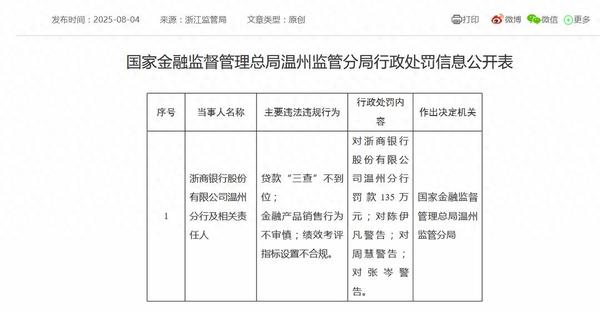 近日,浙商银行又一分支机构被罚,收到百万元级罚单。 8月4日,国家金融监督管理总局温州监管分局对浙商银行温州分行开出百万元级罚单。行政处罚信息公开表显示,浙商银行温州分行因“贷款‘三查’不到位、金融产品销售行为不审慎、绩效考评指标设置不合规”三项主要违法违规事由,被罚款135万元,三名相关责任人同时被警告。 ![]() 这已不是浙商银行今年首次受罚。记者根据国家金融监督管理总局凯发k8娱乐官网app下载官网数据统计,今年以来,浙商银行已累计收下罚单19张,相关分支机构及责任人合计被罚2698万元,平均单张罚单金额达142万元。 其中,7月15日,金融监管总局甘肃监管局公布的行政处罚信息公示表(甘金监行处〔2025〕137号)显示,浙商银行兰州分行因员工行为管理不到位等问题被罚款140万元,两名相关责任人共计被罚15万元,一名责任人被终身禁止从事银行业工作。7月9日,金融监管总局广东监管局公布的行政处罚信息公开表(2025年54号),浙商银行广州分行因个人经营性贷款业务严重违反审慎经营规则,向关系人违规发放贷款,询证函回函信息不实等,被罚款160万元;浙商银行广州番禺支行以及一名责任人因固定资产贷款业务严重违反审慎经营规则,共计被罚款45万元。4月1日,金融监管总局浙江监管局公布行政处罚信息公开表(浙金罚决字〔2025〕5号),浙商银行杭州分行因个人经营性贷款业务中签订空白合同,向保证人隐瞒实际贷款金额,员工与客户发生非正常资金往来,被罚款70万元。 1月27日,浙商银行更是收下千万元级罚单。根据金融监管总局公布的行政处罚信息公开表(沪金罚决字〔2025〕50~57号),浙商银行股份有限公司上海分行因小微企业划型不准确、信贷业务不规范经营、资产池业务未纳入统一授信管理、跨境贷款业务严重违反审慎经营规则等,被责令整改并罚款1680万元;浙商银行上海分行及支行多名相关责任人存在虚增存贷款、信用卡业务不审慎、贷款管理严重违反审慎经营规则等问题,被给予警告、罚款等处罚。
