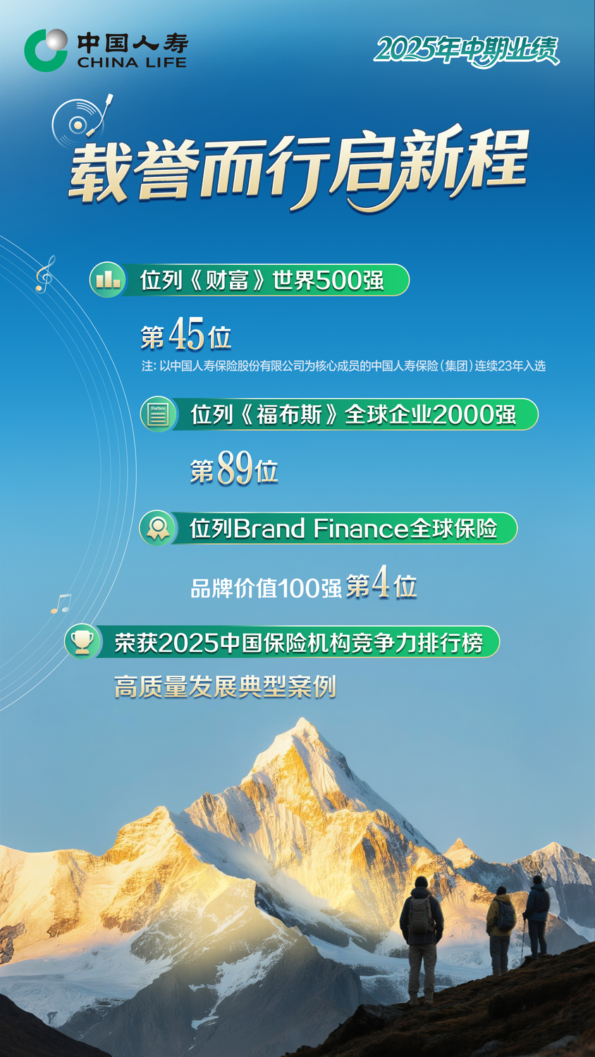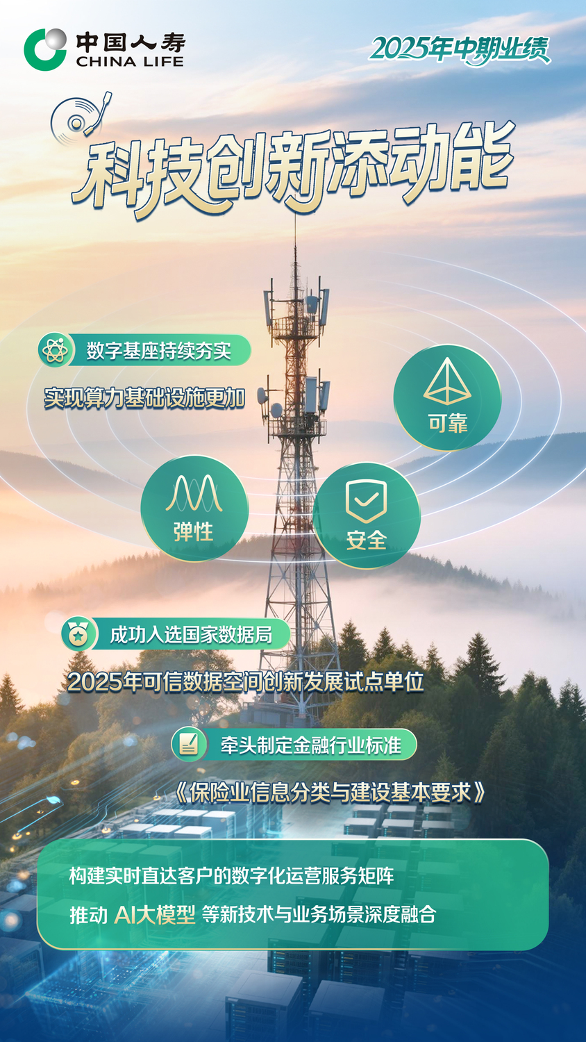8月27日晚间,中国人寿保险股份有限公司(以下简称“中国人寿”,股票代码:601628.sh,2628.hk)发布2025年半年度报告(以下简称“报告”)。 ![]() 2025年上半年,中国人寿坚持高质量发展主题,积极布局应对市场变化,大力推动变革转型,业务发展顺势而上,交出了稳中有进、进中提质、量质齐升、效速兼取的优异答卷。 业务指标保持领先,再迈新台阶。在保持经营大盘稳定的同时,中国人寿各渠道奋力开拓,主要指标再创佳绩。2025年上半年,该公司总保费达5250.88亿元,创历史同期最好水平,同比增长7.3%,市场份额稳步提升。其中,寿险业务总保费4391.34亿元,同比增长8.5%;健康险业务总保费为789.58亿元,同比增长2.0%;意外险业务总保费为69.96亿元。2025年上半年,首年期交保费达812.49亿元,稳居行业榜首;长期竞争优势进一步凸显,十年期及以上首年期交保费达303.05亿元,占首年期交保费比重为37.30%,其中,个险渠道十年期及以上首年期交保费占个险渠道首年期交保费比重超45%。截至2025年6月30日,该公司总销售人力64.1万人,销售队伍规模保持领先;持续推进营销体系改革,队伍质态稳步提高。 经营质效不断优化,再现新突破。中国人寿将资产负债管理理念贯穿经营管理各环节,突出价值和效益导向,规模价值保持领先,经营质效持续提升。积极推进产品供给形态多元、期限多元、成本多元,2025年上半年,该公司人寿保险、年金保险、健康保险新单保费比重分别为30.32%、32.01%、33.42%;大力推动业务结构转型,浮动收益型业务实现强劲增长,在首年期交保费中的占比较上年同期提升超45个百分点,业务结构转型实现突破。公司强化降本增效,积极落实“报行合一”,加强精细化管理,在多元化均衡发展策略下,新业务负债刚性成本进一步下降,费用投入产出效率显著提升。14个月保单持续率达92.10%,同比提升0.6个百分点,发展基础更加牢固。2025年上半年新业务价值实现快速增长,较2024年同期重述结果同比提升20.3%,达285.46亿元,继续引领行业。 综合实力持续提升,再上新高度。中国人寿坚持高质量发展,综合实力持续增强,截至2025年6月30日,中国人寿总资产、投资资产双双突破7万亿元,分别为7.29万亿元和7.13万亿元;归属于母公司股东的股东权益达5236.19亿元,同比增长2.7%;综合偿付能力充足率达190.94%,核心偿付能力充足率达139.54%,持续保持较高水平;内含价值为1.48万亿元,稳居行业首位;拥有长险有效保单件数达3.27亿份。 ![]() ![]() 服务大局更显坚实,再展新担当。中国人寿以1.8万个分支机构织就全国保障网络,落子“世界屋脊的屋脊”西藏阿里,持续延伸服务网络。发挥长期资本、耐心资本优势,坚决当好服务实体经济的主力军,持续加大对战略性新兴产业、先进制造业,以及绿色产业等领域的资金支持,服务大局精准有力。稳步推进中长期资金入市,公开市场权益规模较年初增加超1500亿元,私募证券投资基金累计出资350亿元,以实际行动支持资本市场发展。积极参与黄金等创新品种投资,拓宽保险资金投资渠道,增强投资组合多样性。公司持续提升esg管理效能,以责任金融绘就高质量发展蓝图。 ![]() 此外,中国人寿持续深化资产负债联动,2025年上半年,该公司实现归属于母公司股东的净利润为409.31亿元,同比增长6.9%。注重增强投资者回报水平和获得感,该公司积极响应“提质增效重回报”专项行动,与投资者共享高质量发展成果,董事会建议派发2025年中期现金股息每10股2.38元(含税),中期现金分红达67.27亿元。 个险可持续发展能力稳固 改革增效成果稳步显现 个险渠道以高质量发展为根本遵循,始终坚持价值引领,在稳健经营的基础上,加快推进渠道转型升级,业务结构更加多元。2025年上半年,个险渠道总保费为4004.48亿元,同比增长2.6%,其中,续期保费为3265.63亿元,同比增长10.4%。首年期交保费为640.85亿元,其中,十年期及以上首年期交保费为302.80亿元,占首年期交保费比重超45%,业务可持续发展能力稳固。个险渠道大力推动浮动收益型产品发展,分红险实现快速增长,占个险渠道首年期交保费比重超50%,成为新单保费的重要支撑。个险渠道上半年新业务价值达243.37亿元,同比提升9.5% 。 2025年上半年,个险渠道持续推进营销体系改革,不断强化“客资建队伍”理念,坚持队伍常态运作,稳固队伍管理阵型,深耕“优增优育”,优化队伍结构,不断提升队伍专业化、职业化水平。截至2025年6月30日,个险销售人力为59.2万人,基本保持稳定,其中,营销队伍规模为37.6万人,收展队伍规模为21.6万人,队伍优增优育取得实效,优增人力同比提升27.6%。 落实“报行合一”降本增效 银保渠道规模价值双提升 银保渠道积极推动渠道转型,持续拓宽银行合作,网点经营扩面提质。聚焦专业化建设,推动队伍提质增效。丰富银保产品体系,满足客户多元化需求。 2025年上半年,银保渠道各项核心指标全面提升,总保费达724.44亿元,同比增长45.7%;新单保费达358.73亿元,同比增长111.1%;首年期交保费达170.32亿元,同比增长34.4%;续期保费达365.71亿元,同比增长11.7%,占渠道总保费的比重为50.48%。银保渠道客户经理为1.8万人,人均产能同比大幅提升51.8%。 政策性健康险扎实推进 支持多层次医疗保障体系建设 坚持以效益为中心,团险渠道聚焦专业经营,加强精细管控,优化转型传统业务,推进短期险业务稳步发展。2025年上半年,团险渠道总保费为144.37亿元;其中,短期险