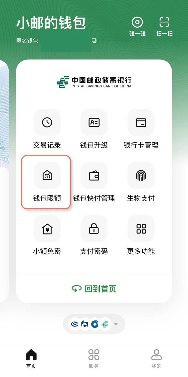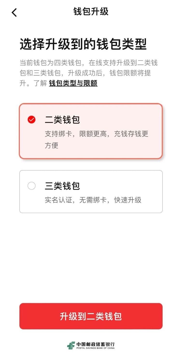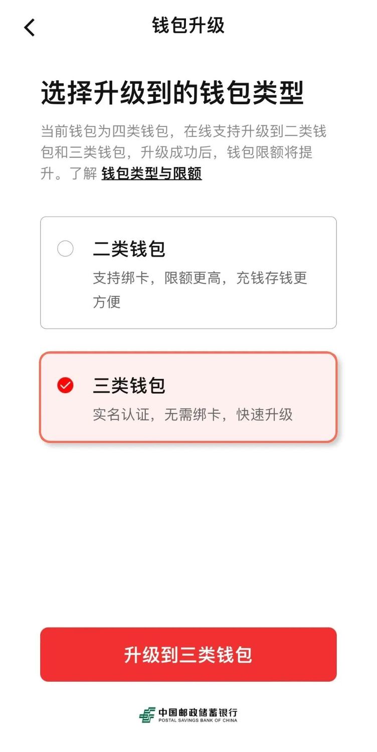 ![]() ![]() ![]() 还没有开通邮储银行数字人民币钱包? 点这里,教您快速开通钱包 第一步 进入数字人民币app【凯发k8娱乐凯发k8娱乐官网app下载官网app下载首页】,点击钱包翻转至背面,点击【钱包升级】。 >>>左右滑动查看更多<<< ![]() ![]() 或进入数字人民币app【凯发k8娱乐凯发k8娱乐官网app下载官网app下载首页】,点击【我的】-【软钱包】,选择需要升级的钱包,点击【升级钱包】。 >>>左右滑动查看更多<<< ![]() ![]() 第二步 ① 无需绑卡,实名认证升级至三类钱包 【钱包升级】页面,选择【三类钱包】,点击页面下方【升级到三类钱包】。根据页面提示输入钱包支付密码、身份信息,通过人脸识别后输入短信验证码,即可升级为三类钱包。 >>>左右滑动查看更多<<< ![]() ![]() ② 实名加绑卡,升级至二类钱包 【钱包升级】页面,选择【二类钱包】,点击页面下方【升级到二类钱包】。根据页面提示输入钱包支付密码、身份信息,通过人脸识别后,输入银行卡号进行绑定,即可升级为二类钱包。 >>>左右滑动查看更多<<< ![]() ![]() ③ 升级至一类钱包 请携带身份证前往邮储银行网点办理。 如有疑问,可详询数字人民币试点地区邮储银行网点或客服热线95580。 ![]() 解锁 随用随充 功能 支付真的可以那么丝滑 ① 进入数字人民币app【凯发k8娱乐凯发k8娱乐官网app下载官网app下载首页】,点击【我的】,点击【支付设置】,选择【随用随充】,开启随用随充功能(钱包需升级至二类及以上)。 ② 已绑卡钱包开启【随用随充】设置,即可在钱包余额不足时,自动从已关联银行卡充钱到钱包中并完成支付。 >>>左右滑动查看更多<<< ![]() ![]() 解锁不同支付限额 大额消费转钱不用愁 ① 进入数字人民币app【凯发k8娱乐凯发k8娱乐官网app下载官网app下载首页】,点击钱包翻转至背面,点击【钱包限额】可查看当前钱包消费、转钱限额。 ② 点击提示中【运营机构钱包限额】,可查看各运营机构钱包限额。 ③ 钱包实名程度越高,限额上限越高。 >>>左右滑动查看更多<<< ![]() ![]() 【数币指南】系列教程 →不会开钱包,点我 →不会充钱包,点我 →不会存银行,点我 →不会钱包快付,点我 →不会发数字人民币现金红包,点我 温馨提示:仅试点地区客户可开通数字人民币钱包,数字人民币已在北京,天津,河北省,大连,上海,江苏省,浙江(杭州、宁波、温州、湖州、绍兴、金华),福建(福州、厦门),山东(济南、青岛),长沙,广东省,广西(南宁、防城港),海南省,重庆,四川省,云南(昆明、西双版纳),西安开展试点,试点地区以数字人民币app注册页面显示为准。