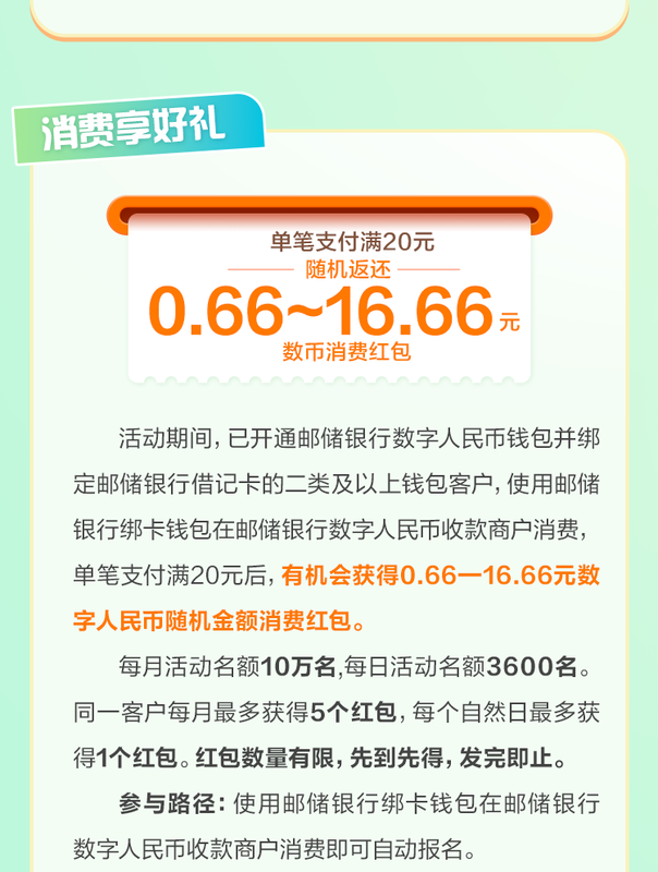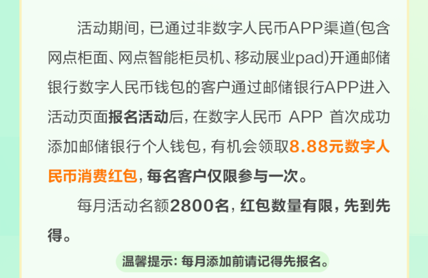 ![]() ![]() ![]() 活动规则 向上滑动阅览 一、活动时间 2025年8月12日00:00:00至2025年9月30日23:59:59 二、活动对象 已通过非数字人民币app渠道(包含网点柜面、网点智能柜员机、移动展业pad))开通邮储银行数字人民币个人钱包且未将邮储银行数字人民币个人钱包添加至数字人民币app的客户 三、活动细则 (一)活动内容 活动期间,已通过非数字人民币app渠道(包含网点柜面、网点智能柜员机、移动展业pad))开通邮储银行数字人民币钱包的客户通过邮储银行app进入活动页面报名活动后,在数字人民币 app 首次成功添加邮储银行个人钱包,有机会领取8.88元数字人民币消费红包,每名客户仅限参与一次。每月活动名额2800名,红包数量有限,先到先得,领完即止。 (二)参与流程 1.活动报名 符合活动参与条件的客户,进入邮储银行app【数字人民币专区】-【生活】,点击【体验任务】,进入任务页面,在任务列表中查看【数币“邮”心意 添加享好礼】任务,点击【去体验】报名参与活动。 2.钱包添加至数字人民币app (1)符合活动参与条件的客户在活动页面点击【去体验】后,若客户已下载数字人民币app,则跳转到数字人民币app开通或添加数字钱包页面,点击“同意并开通”按钮,输入验证码及钱包支付密码后,完成钱包添加; (2)符合活动参与条件的客户在活动页面点击【去体验】后,若客户未下载数字人民币app,则跳转至下载数字人民币app页,点击立即下载,下载完成后点击新用户注册,输入手机号-注册-输入验证码-设置登录密码-开通或添加数字钱包页面,点击“同意并开通”按钮,输入验证码及钱包支付密码后,完成钱包添加。 3.奖励领取 完成钱包添加至数字人民币app体验任务的客户,返回任务页面有机会获得8.88元数字人民币消费红包。客户可在任务页面【奖励明细】中查看红包奖励,也可在邮储银行app【数字人民币】-【凯发k8娱乐凯发k8娱乐官网app下载官网app下载首页】-【我的红包】或数字人民币app【服务】-【消费红包】中查看红包奖励。 (三)奖励说明 1.消费红包有效期30天。超过有效期未使用的消费红包将回收至活动组织方,不予以补发,请在有效期内及时使用。消费红包不可提现、转赠,可在所有支持数字人民币收款的商户处使用。 2.本活动奖励仅向报名活动成功、在当月参与并满足活动条件要求的客户发放。活动结束后,不做任何追加奖励,完成任务后请及时查看领取奖励。 (四)其他说明 1.本活动客户仅限为在数字人民币 app 首次成功添加邮储银行个人钱包的客户。 2.符合同一钱包编号、同一手机号、同一身份证号等任一条件的,均视为同一用户,不可重复参加。 3.活动期内,若报名后注销钱包或修改钱包关联手机号,将影响任务完成记录及奖励红包的正常发放。因客户注销钱包或修改钱包关联手机号无法领取奖励的,不予以补发。 4.本活动仅限数字人民币试点地区客户报名参与,数字人民币已在北京,天津,河北省,大连,上海,江苏省,浙江(杭州、宁波、温州、湖州、绍兴、金华),福建(福州、厦门),山东(济南、青岛),长沙,广东省,广西(南宁、防城港),海南省,重庆,四川省,云南(昆明、西双版纳),西安开展试点,试点地区以数字人民币app注册页面显示为准。 四、注意事项 (一)客户存在以下任一情形的,不得参与本活动;已经参与活动的,不予以发放奖励,不可领取奖励;如奖励已发放的,中国邮政储蓄银行股份有限公司有权撤销客户获奖资格,并要求客户返还奖励;情节严重的,中国邮政储蓄银行股份有限公司有权禁止客户参加所有营销活动及追究客户相应的法律责任: 1.客户通过任何不正当手段或以违反诚实信用原则的方式参与活动,或客户存在任何扰乱活动秩序的行为,或客户存在有碍其他客户公平参与本活动的行为;包括但不限于恶意使用多个账号参与本活动,虚假注册和交易,提供虚假交易信息,盗用他人账户,使用虚假手机号,恶意套取奖励,修改设备数据,使用模拟器、插件、外挂、机器人等方式参与活动等; 2.客户存在其他违法违规行为、违约行为或违反诚实信用原则的行为; 3.客户不属于本活动对象。 (二)如因不可抗力、相关政策、活动调整等原因导致本活动调整、暂停或无法进行的,中国邮政储蓄银行股份有限公司在法律允许范围内,可保留调整、暂停和终止本活动的权利,并经活动页面公告后生效。 五、温馨提示 本活动及产品由中国邮政储蓄银行股份有限公司提供,如对本活动存在疑问,可致电邮储银行24小时客服热线95580进行咨询。 ![]() ![]() ![]() 活动规则 向上滑动阅览 一、活动时间 2025年8月12日00:00:00至2025年9月30日23:59:59 二、活动对象 已开通邮储银行数字人民币实名钱包的客户 三、活动细则 (一)活动内容 活动期间,已开通邮储银行数字人民币实名钱包(包括一类、二类、三类数字人民币钱包)的客户通过邮储银行app进入活动页面报名后,邀请从未开通过邮储银行数字人民币钱包的好友开通邮储银行数字人民币钱包并升级为二类及以上钱包,有机会与好友随机瓜分12.88数字人民币消费红包。 每月活动名额38800名,活动期间同一客户最多可邀请50名好友参与瓜分,红包数量有限,先到先得,领完即止。 (二)参与流程 1.活动报名 符合活动参与条件的客户,进入邮储银行app【数字人民币专区】-【生活】,点击【体验任务】,进入任务页面,在任务列表中查看【数币“邮”