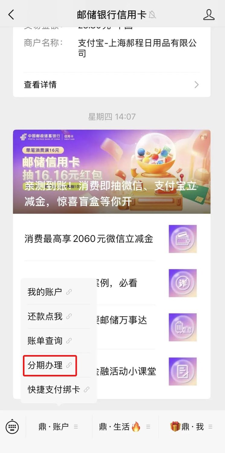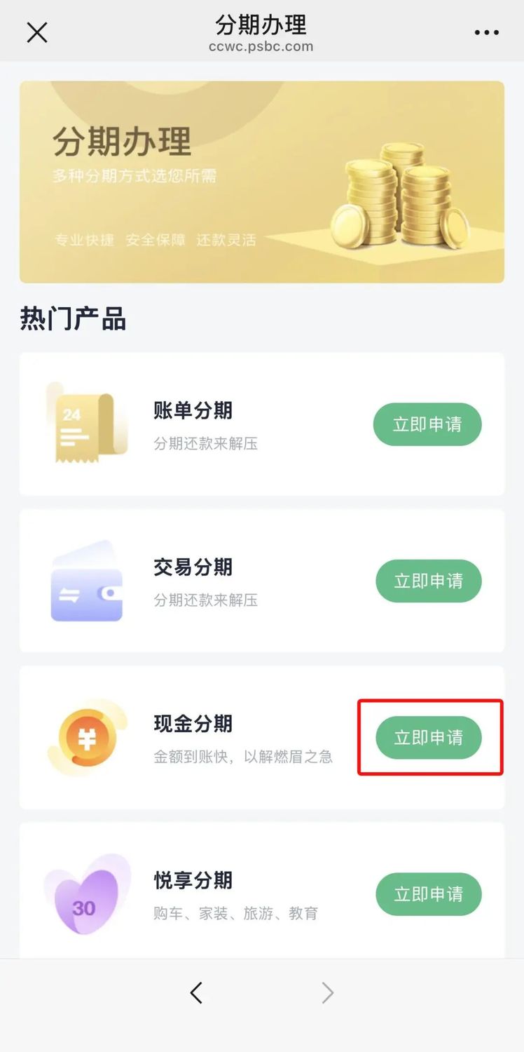 福利预警!! 邮储信用卡现金分期福利大放送! 分期利率最低折扣1.7折, 为你解锁资金新可能! 分期本金1万元办12期,折后每期分期利息仅12.75元,连杯奶茶钱都不到!这波优惠血赚不亏! 无论是想实现购物自由,还是解决临时资金周转难题,都能轻松应对。 (最终利率详情请以办理页面展示为准) 01 现金周转,分期无忧 现金分期业务,是指持卡人可将信用卡现金分期额度内的资金转入本人本行借记卡,分期偿还并支付一定利息的业务。 注:现金分期仅限主卡持卡人申请,附属卡持卡人不可申请。 02 期数灵活,自由选择 分期期数支持1期、3期、6期、9期、12期、18期、24期,分期金额灵活选择,最低500元,最高不超过现金分期可用额度,可根据需要选择分期期数和分期金额。 03 价格透明,按需办理 假设您申请了1万元的现金分期,分期金额从次月账单日再开始还款,之后每期账单应还额=(1万元/期数) 每期分期利息 当期账单其他金额,其中每期分期利息=分期总本金*每期分期利率,具体示例如下: ![]() 注:具体分期利率等信息根据当期活动,以具体办理时页面或工作人员告知为准。 现金分期办理超便捷, 多种渠道随心选! 您可通过信用卡客服热线40088-95580电话办理,或在收到我们的邀约电话时直接办理; 也可登录邮储银行 app、邮储信用卡 app 、邮储银行信用卡微信公众号动动手指轻松办理。 操作简单,资金秒达, 让您轻松解决资金需求!快来体验吧~ (现金分期额度以页面展示为准。) 01 邮储银行app渠道 点击邮储银行app凯发k8娱乐凯发k8娱乐官网app下载官网app下载首页下方“信用卡”按钮,进入信用卡界面,下滑页面至“分期服务”模块,点击“现金分期”,进入现金分期办理界面。 ![]() 02 邮储信用卡app渠道 点击邮储信用卡app凯发k8娱乐凯发k8娱乐官网app下载官网app下载首页下方“信用卡”按钮,进入信用卡界面,在“我要分期”模块下点击“现金分期”,即可进入现金分期办理界面。 ![]() 03 邮储银行信用卡微信公众号渠道 进入“邮储银行信用卡”微信公众号,点击左下角“鼎·账户”,选择“分期办理”,登录后进入分期办理页面,点击现金分期“立即申请”即可办理。 ![]() ![]() 分期小贴士 1.我可将现金分期款项用于哪些用途? 答:现金分期转出款项仅能用于家庭日常消费(包括但不限于购车、装修、教育、娱乐、旅游、婚庆等),不得用于个人投资理财(包括但不限于股票、期货等)、偿还信用卡、偿还其他贷款或债务、经营资金周转、房地产等用途。 2.我申请了一笔现金分期,申请后发现不需要这笔资金了,可以撤销这笔分期申请吗? 答:现金分期申请成功后不可撤销,您可以申请提前还款。如申请提前还款,将收取未分摊本金的3%作为违约金。 上一篇: 建军节︱山河万里 邮军相伴