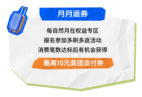 ![]() ![]() ![]() ![]() ![]() ![]() ![]() ![]() ![]() 美团联名借记卡权益细则 向上滑动阅览 一、活动时间 2025年6月17日0:00至2025年12月31日23:59分。 二、活动权益领取及兑换时间 2025年6月17日0:00至2025年12月31日23:59分。 三、活动对象 美团联名借记卡(以下简称“美团卡”)持卡人,并将该卡绑定美团支付。 四、活动内容 1.首绑领取10元支付券 活动期间,客户首次在权益专区(权益专区为:邮储联名卡微信公众号—权益馆-美团卡权益,或美团app—我的—钱包—银行卡—邮储联名卡,下同)通过美团支付绑定美团卡,绑卡成功后可获得10元美团支付券,含2张5元无门槛支付券。 支付券有效期7天,过期未使用视为自动放弃该权益,不再补发。 同一客户限领1次,同一银行卡卡号、同一身份证号、同一美团账户、同一美团绑定手机号其中任一条件都视为同一客户。 2.天天消费随机减最高10元 活动期间,已在美团绑定美团卡的客户每日通过美团/大众点评/美团外卖app等美团旗下app下单即有机会享受0.1元-10元随机立减的优惠。 同一客户每日可享受1次,同一银行卡卡号、同一身份证号、同一美团账户、同一美团绑定手机号满足其中任一条件都视为同一客户。 3.周周抽大奖,最高得88元支付券 活动期间,已在美团绑定美团卡的客户每自然周可在权益专区参加1次抽奖,每次可领取最高88元的随机面额支付券。每周限量100万份,先到先得,抽完为止。 支付券有效期7天,过期未使用视为自动放弃该权益,不再补发。 同一客户每周限抽奖一次,同一银行卡卡号、同一身份证号、同一美团账户、同一美团绑定手机号满足其中任一条件都视为同一客户。 4.月月多刷多返享最高返10元支付券 活动期间,已在美团绑定美团卡的客户,每自然月可在权益专区报名参与多刷多返活动,报名成功后使用美团支付选择美团卡完成指定笔数消费后,有机会获得相应支付优惠奖励,最高可得10元美团支付券。 1)每自然月报名成功即可获得1元美团支付现金券; 2)每自然月使用美团卡累计消费笔数满3笔,即可获得2元美团支付券; 3)每自然月使用美团卡累计消费笔数满5笔,即可获得3元美团支付券; 4)每自然月使用美团卡累计消费笔数满10笔,即可获得4元美团支付券; 参与活动限制: 1)有效支付笔数:在美团/大众点评/美团外卖app等美团旗下app使用美团卡下单,单笔银行卡实付金额≥5元可累计活动消费笔数; 2)累计活动笔数上限:每个自然日最多累计5笔,超过5笔后,当天后续交易将不会计入活动消费笔数; 3)支付笔数退款:达标发奖前有效支付订单全部退款,将回退达标笔数,部分退款后如订单剩余部分满足有效支付金额门槛,则不会回退达标笔数; 4)累计笔数有效时间:用户报名成功后至当月活动结束,活动结束后产生的订单将不再计入任务有效达标笔数; 5)奖励发放及使用:任务达标成功后奖励自动到账,支付券有效期7天,过期未使用视为自动放弃该权益,不再补发。 同一客户每月限参与1次,同一银行卡卡号、同一身份证号、同一美团账户、同一美团绑定手机号满足其中任一条件都视为同一客户。 五、其他注意事项 1.支付券使用规则:支付券仅支持美团卡通过“美团支付”方式支付使用。 2.支付券查询:【美团/大众点评/美团外卖app等美团旗下app】-【我的】-【钱包】-【支付券】。 3.支付券适用于美团旗下所有app使用,但不可兑换现金、消费余额不累计、不找零,不可转让他人使用。 4.使用了支付券的订单,订单支付成功后发生部分退款等情况,支付券视作已使用不退回,亦不再补偿支付券。 5.由于版本限制,请将活动app手机客户端升级到最新版本参与活动。 6.活动过程中,客户如出现作弊行为(如批量注册、恶意购买、虚假分享、虚假交易、恶意套利等),或使用外挂、插件及其他破坏活动规则,违背活动公平的方式,将取消客户的交易资格及作弊订单,并在必要时追究法律责任。 7.如出现不可抗力或情势变更的情况(包括但不限于重大灾害事件、活动受政府机关指令需要停止举办或调整的、活动遭受严重网络攻击或因系统故障需要暂停举办的),邮储银行和美团保留调整、暂停和终止本活动的权利,经邮储银行官方网站(凯发k8娱乐官网app下载官网地址:https://www.psbc.com)公告后生效,并可依相关法律法规的规定主张免责。 8.如对活动有疑问请咨询美团客服电话95172或邮储银行客服电话95580。 ![]() 扫码办理邮储银行美团联名借记卡,尽享超值优惠!