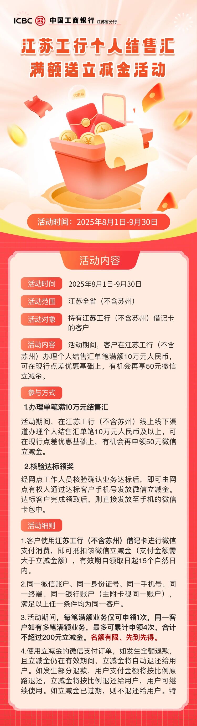 【满减】江苏工行个人结售汇,满额最高可送200元立减金! -凯发k8娱乐官网app下载