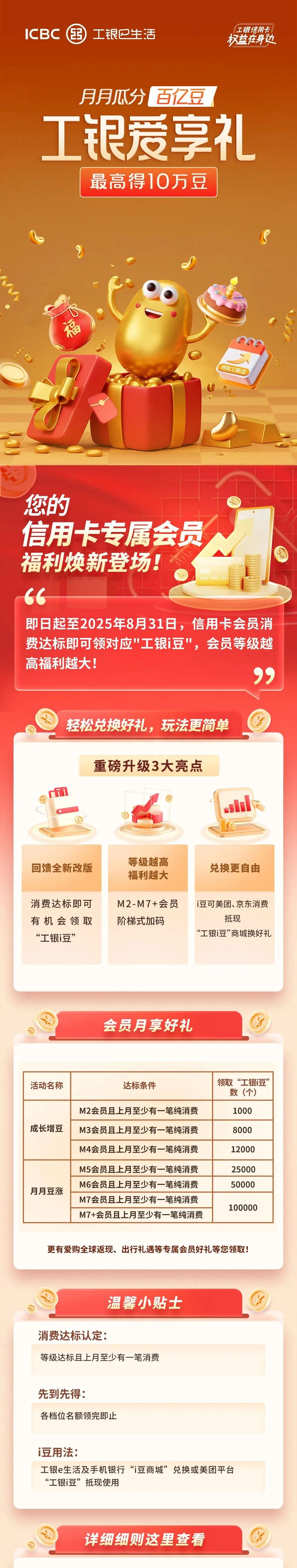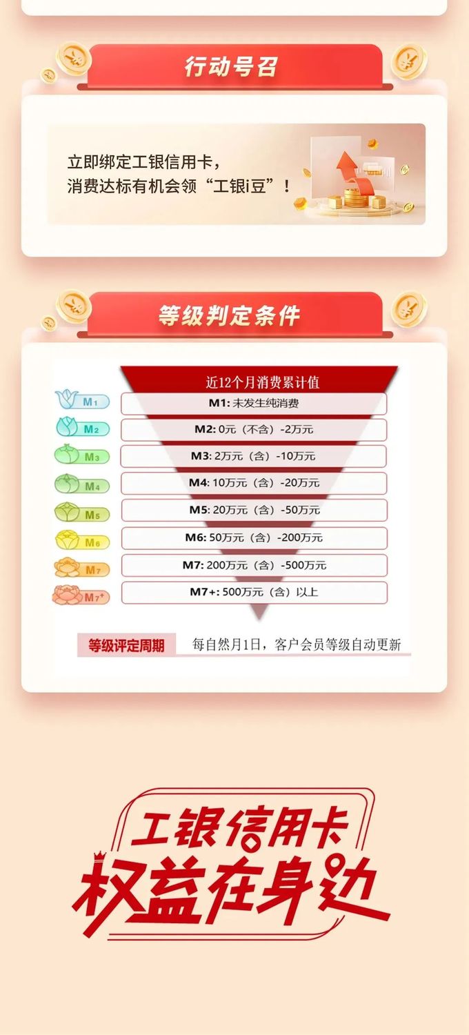 ![]() 向上滑动阅览 一、领“工银i豆”规则 m2-m7 信用卡会员且上月至少有一笔消费客户每月有机会参加,具体内容为:m2客户每月有机会领取1000豆;m3客户每月有机会领取8000豆;m4客户每月有机会领取1.2万豆;m5客户每月有机会领取2.5万豆;m6客户每月有机会领取5万豆;m7及m7 客户每月有机会领取10万豆。名额有限,先到先得。 ![]() 二、专属权益 专属权益内各活动以进入活动专区内细则显示为准。 三、特别说明 (一)同一身份证号、银行卡号、手机设备、手机号码,满足其中任意一个条件均视为同一客户。 (二)工银i豆相关说明。 1.通过“工银爱享礼”活动领取的工银i豆有效期为1年。每年12月底到期的“工银i豆”具体到期日为12月30日,其他月份到期的“工银i豆”具体到期日为到期当月最后一日。例如,2025年6月发放的消费积分转换为“工银i豆”后,在2026年6月30日(含)之前有效。 2.“工银i豆”可在中国工商银行手机银行“工银i豆”商城、工银e生活app及e生活小程序“工银i豆”商城、指定特约商户和指定第三方平台等渠道兑换。具体兑换项目、兑换标准及兑换规则以各渠道兑换详情页面展示为准。可登录中国工商银行手机银行-我的-工银i豆或工银e生活-工银i豆查看具体情况。 (三)卡片被冻结、止付、收卡、销户,或发生欺诈、套现、逾期还款、对中国工商银行其他债务不偿还的、发生或涉嫌发生从事违法、违规、违反牡丹信用卡章程、领用合约或本活动办法及其他相关规定等情形的,即丧失参加本活动的资格,中国工商银行具有告知客户并采取相应法律措施的权利。 (四)根据业务发展、市场变化等原因,我行可动态调整活动内容,具体以页面展示为准。 (五)各项购买的礼品/服务以服务详情页面规则的使用流程及相关第三方平台使用规则为准,一经领取或购买成功,除有特别说明、处理失败以外原则上不可取消、 (六)在中国法律许可范围内我行有权修改相关规则,包括但不限于活动时间、客户参加资格、回馈规则、奖励名额以及本规则其他内容、暂停或终止本活动,并按照法律法规及相关监管规定要求,经相关途径(如网站等)公告后生效。 (七)如有问题,可通过营业网点、门户网站或中国工商银行手机银行app在线客服咨询或拨打95588。 (八)我行与礼品/服务供应商间无合伙、经销、代理关系或共用出售人或保证人关系,本活动供应商所提供的礼品或服务的有关责任及凯发k8娱乐官网app下载的售后服务有关争议、纠纷等由各供应商负责。 ![]() 下一篇: 【福利】爱购洗车礼享8.8元洗车!