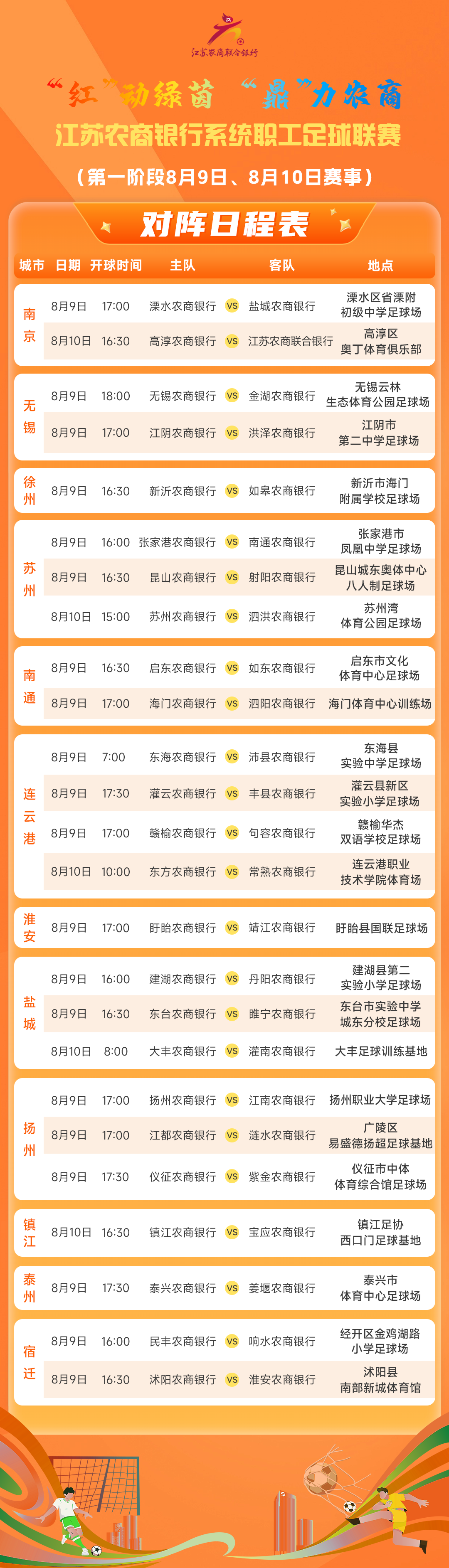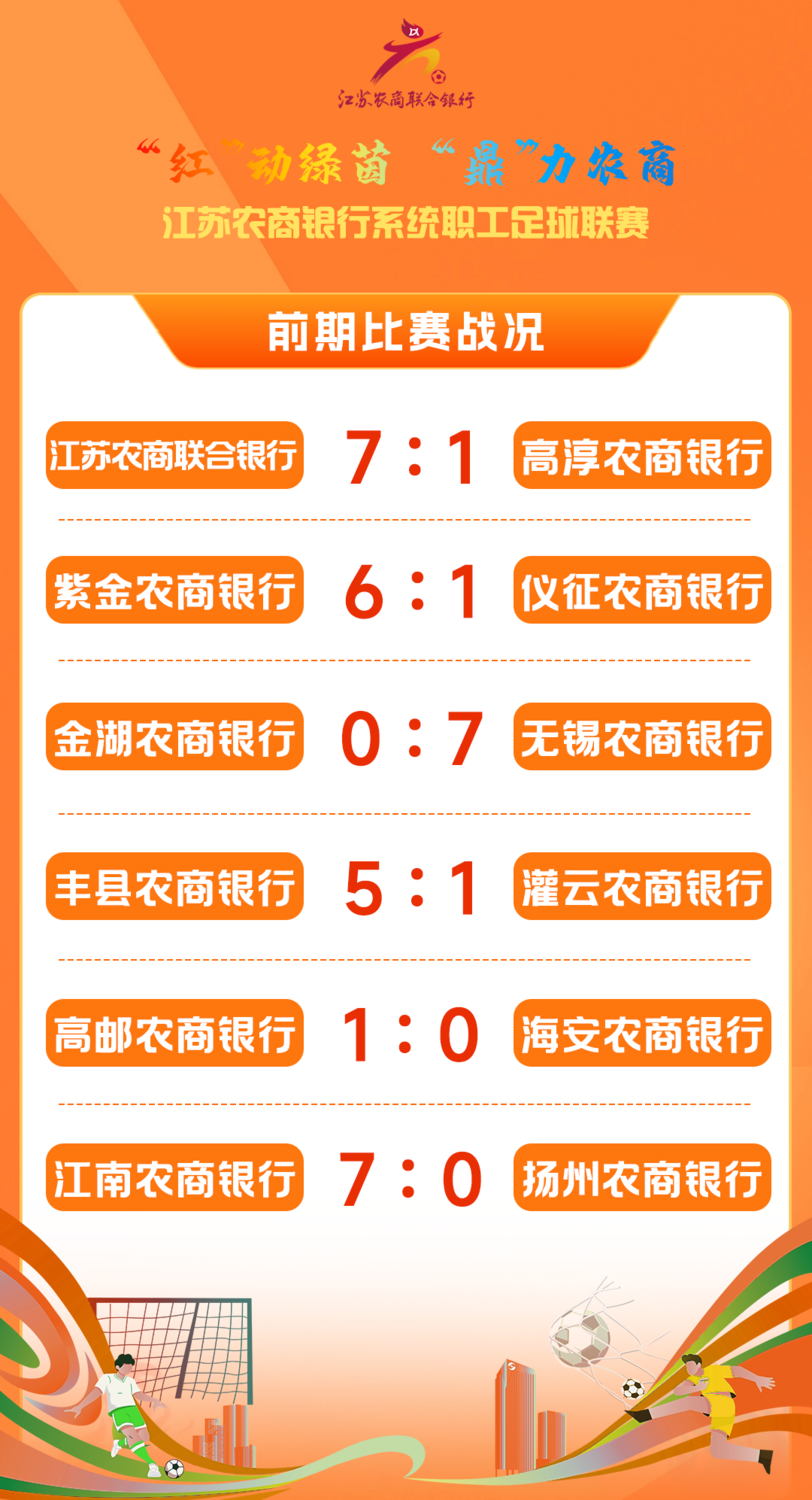 点开“苏超”的比赛日程 发现本周末没有比赛 球迷们别着急! “红”动绿茵 “鼎”力农商 江苏农商银行系统职工足球联赛 热血点燃,火热开踢 免票入场,让您尽享大众足球的乐趣! 几点开球?在哪比赛? 小编已将比赛信息表码好 时间/地点/球队一目了然 速速约上球搭子 去现场感受激烈的比赛氛围 为农商银行球队加油助威! ![]() 注:如遇特殊情况,赛事时间、地点需要调整的,以主场球队公布为准。 对阵日程表火热出炉 激战一触即发! 在等待激烈对决前 一起来回顾 前期赛事战况和比赛精彩视频 比赛战报 ![]()