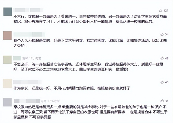 今年以来,广东部分学校不再硬性要求学生穿校服返校,教育部将“强制购买校服”列入负面清单——一系列事件让校服管理成为教育领域的热议焦点。在“不强制购买”已成政策共识的背景下,一些地方出现了“全面暂停校服征订”的极端做法。这种非此即彼的管理方式,实则曲解了政策初衷。 ![]() 教师带着一年级新生参观校园。新华社发(秦廷富摄) 实际上,2023年12月,教育部发布《关于全面实施学校美育浸润行动的通知》,强调以美育浸润学校,打造昂扬向上、文明高雅、充满活力的校园文化,建设时时、处处、人人的美育育人环境。其中,校服作为校园文化的重要载体,承载着集体记忆与身份认同的功能,更在潜移默化中培养了学生的审美能力与集体荣誉感。因此,简单“暂停征订”不仅割裂了校服与教育的内在联系,更可能错失以美育浸润校园的实践契机。 在校园里,学生来自不同的家庭背景。统一穿着校服意味着无论学生的家庭背景如何,他们在校园内都享有平等的身份和待遇。如果禁止学生穿着校服,那么昂贵的名牌服饰可能会成为一些学生炫耀的资本,而穿着朴素的学生可能会因此感到自卑或受到排挤。而统一穿着校服则能有效减少这种经济差异带来的心理影响,让学生更加专注于学习和相互之间的交往。它让学生意识到,个人的价值并不取决于外在的物质条件,而是取决于内在的品质和能力。这种认识有助于培养学生的自信心和自尊心,激发学生的学习热情和创造力,提高他们的学习效果和综合素质。 与此同时,校服作为一种经济实惠的着装选择,其经济性优势显而易见。校服的价格相对亲民,与市场上动辄数百甚至上千元的童装品牌相比,适合大多数家庭的经济承受能力。同时,学校在选择校服供应商时,通常会经过严格地筛选和把关,确保校服的质量符合相关标准和要求。校服的耐用性也较强。由于学生在校期间活动频繁,衣物磨损较快。而校服通常采用耐磨、耐洗的面料制成,能够有效延长使用寿命,减少更换频率。这样一来,家长就无需频繁为孩子购买新衣,从而节省了大量的开支,在网上获得不少支持。 越来越多的家长深刻体会到校服所蕴含的丰富价值,他们在社交媒体上积极表达对高品质校服的喜爱与推崇。另一方面,由于校服所承载的集体标识性,它能有效区分社会人员与学生群体,从而确保学生在校园内外的人身安全,进一步让家长对学生更加安心。在一些尚未订购校服的学校,家长甚至自发组织起来,寻求购买统一的班服,只为确保孩子健康安全。 ![]() 家长支持穿着校服。网络截图 客观而言,中小学生校服并非多余。而“不得强制购买校服”和“不强制穿校服”,也并非意味着取消校服,而是管理更加柔性、灵活。实现“不强制”与“保征订”的平衡,需要建立科学的校服管理机制。这种机制应当包含三个核心支柱:民主决策的参与机制、灵活多元的供给机制、全程透明的监管机制。校服管理应当因地制宜、因校施策,而非追求“一竿子打死”的简单化处理。 下一篇: 钱亚南 | 协鑫青年力量@全球能源舞台