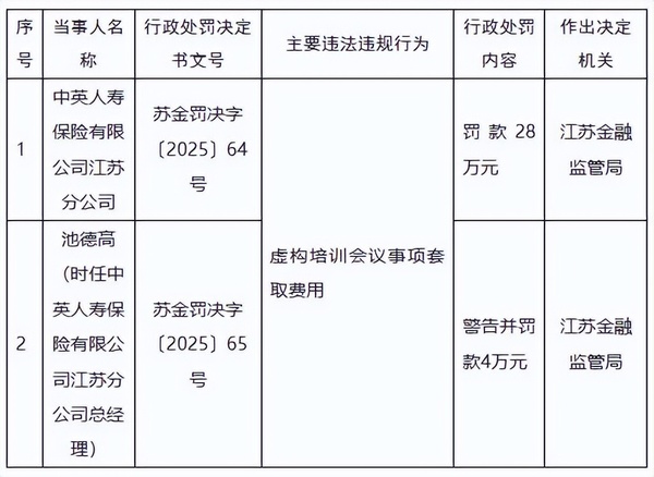 近日,国家金融监督管理总局江苏监管局行政处罚信息公开表显示,中英人寿保险有限公司江苏分公司因虚构培训会议事项套取费用,被罚款28万元。池德高(时任中英人寿保险有限公司江苏分公司总经理)受到警告并被罚款4万元。