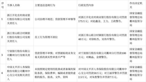 近日,据国家金融监督管理总局衢州监管分局行政处罚信息公开表显示,宁波银行股份有限公司衢州分行因贷款管理不审慎、对票据贴现业务交易关系的真实性审查不严等,被罚款100万元。同时,赖晶、金熠因贷款管理不审慎、对票据贴现业务交易关系的真实性审查不严等,被警告。 以下为罚单详细信息: ![]()