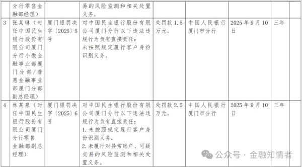 9月18日,中国人民银行厦门市分行行政处罚信息公示表显示,中国民生银行股份有限公司(下简称“民生银行”)厦门分行存在以下5项违法行为类型,被警告,通报批评,并处罚款合计147.96万元。 5项违法行为分别为:1.违反反假货币业务管理规定;2.违反数据安全管理规定;3.未按照规定履行客户身份识别义务;4.未履行对异常账户、可疑交易的风险监测和相关处置义务;5.违反账户管理规定。 同时,时任民生银行厦门分行零售金融部经理郭某明对该行未履行对异常账户、可疑交易的风险监测和相关处置义务负有直接责任,被罚款1万元;时任民生银行厦门分行小微金融事业部厦门分部/普惠金融事业部厦门分部副总经理张某琳对该行未按照规定履行客户身份识别义务负有直接责任,被罚款1.5万元;时任民生银行厦门分行零售金融部副总经理林某泉对该行未履行对异常账户、可疑交易的风险监测和相关处置义务,未按照规定履行客户身份识别义务负有直接责任,被罚款2.5万元。 就在本周,民生银行刚因系统使用管控不到位、基础软件版本管理不足、生产运维管理不严等,被罚款590万元。 民生银行今年最大的罚单来自于今年1月,民生银行因违反账户管理规定、违反清算管理规定、违反反假货币业务管理规定、占压财政存款或者资金等多项违规,被中国人民银行警告,并没收违法所得99万元,罚款1705.5万元。 此外,民生银行还 2月,民生银行泉州分行因个人贷款贷前调查不尽职、贷后管理不到位;流动资金贷款未合理测算营运资金需求,贷后管理不到位;不良资产处置程序不合规;发放经营性物业贷款不审慎等多项违规行为,被泉州金融监管分局处以罚款250万元的行政处罚。时任民生银行泉州分行资产保全部总经理曾宝华和时任民生银行石狮支行客户经理杨建康因上述违规行为被泉州金融监管分局处以警告。 1月,民生银行苏州分行因流动资金贷款转存银票保证金、贷款用途管理不到位被罚款115万元。同时,民生银行常熟支行副行长龚某因流动资金贷款转存银票保证金被警告并处罚款9万元;时任民生银行小微金融事业部苏州分部总经理陈因贷款用途管理不到位被警告并处罚款7万元。 民生银行2025年半年报显示,今年上半年,该行营业收入为723.84亿元,同比增长7.83%,但归母净利润为213.80亿元,同比降4.87%。主要因信用减值损失同比增长26.70%。 其中,发放贷款和垫款减值损失为234.52亿元,同比增长29.40%。去年同期,该行发放贷款和垫款减值损失则同比降6.75%。 此前,该行贷款减值损失已连降四年,2021年—2024年同比降幅分别为23.81%、28.92%、4.51%、2.03%。 如今,该行贷款减值损失重拾升势,加大对该行资产质量的考验。 与贷款减值损失大增相应,今年上半年末,民生银行不良双升。其中,不良贷款额为660.52亿元,较上年末增长0.67%;不良贷款率为1.48%,较上年末升0.01个百分点。 不良贷款中,个贷不良额较上年末增长3.48%,不良率为 1.89%,较上年末升0.09个百分点。其中,小微贷款不良率为1.56%,较上年末升0.02个百分点;信用卡不良贷款率为3.68%,较上年末升0.4个百分点。