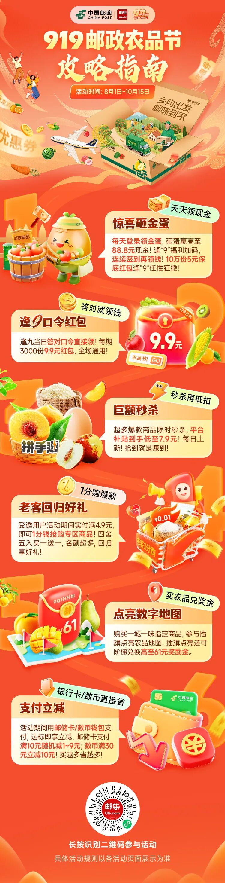 邮乐919 邮政农品节 活动攻略 一年一度的邮乐919购物节终于来啦! 活动期间优惠满满、福利多多 为了让大家轻松买买买 我们准备了一份超全攻略,带你玩转919! 活动时间:8月01日-10月15日 01 核心玩法一览 ![]() 惊喜砸金蛋【天天领现金】 每天登录领金蛋,砸蛋赢高至88.8元现金!逢“9”福利加码,连续签到再领钱!10万份5元保底红包逢“9”任性狂撒! 逢九口令红包【答对就领钱】 逢九当日答对口令直接领!每期3千份9.9元红包,全场通用! 巨额秒杀【秒杀再抵扣】 超多爆款商品限时秒杀,平台补贴到手低至7.9元!每日上新!抢到就是赚到! 老客回归好礼【1分购爆款】 受邀用户活动期间实付满4.9元,即可1分钱抢购专区商品!四舍五入买一送一,名额超多,回归享好礼! 点亮数字地图【买农品兑奖金】 购买一城一味指定商品,参与插旗点亮农品地图,插旗点亮还可阶梯兑换高至61元奖励金。 支付立减【银行卡/数币直接省】 活动期间用邮储卡/数币钱包支付,达标即享立减,邮储卡支付满10元随机减1-9元;数币满30元立减10元!买越多省越多! ![]() 实用小贴士 提前收藏:提前将心仪商品加入购物车,活动开始一键下单! 关注时间:秒杀、口令红包等活动记得设好提醒,准点参与才能抢到哦! 分享好友:好农品让大家都尝到,呼朋引伴一起省! 邮乐919 一年仅一次的超值购物盛宴! 攻略在手,优惠你有! 赶紧准备好,一起开心购吧! 识别二维码,进入主会场!一起买买买吧~ ![]() 上一篇: 数币邮礼,话费充值立减优惠快来get!