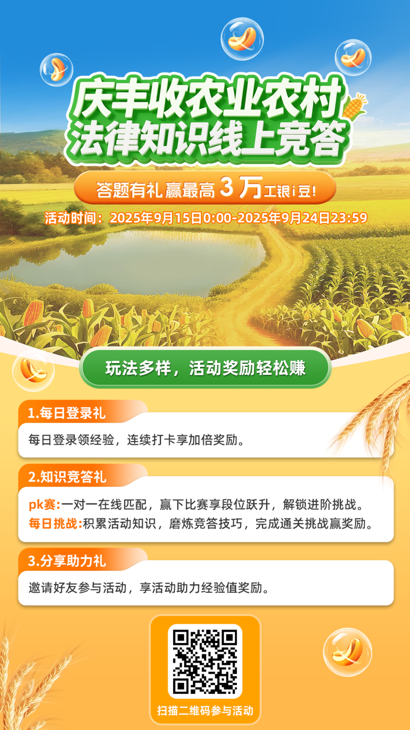 【答题有礼】参与“庆丰收农业农村”法律知识线上竞答赢最高3万工银i豆! -凯发k8娱乐官网app下载