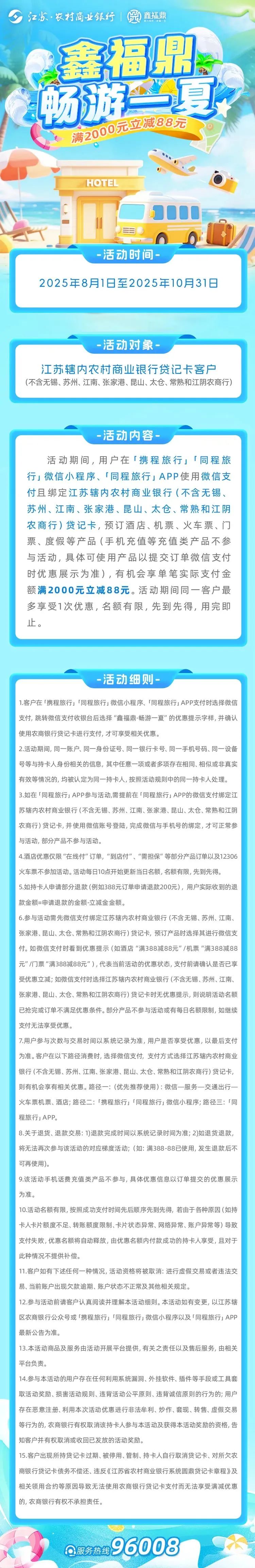 城市的格子间待久了 厌倦了日复一日的两点一线 困住向往野性的心 四季俱可喜,最好新秋时 暂别眼前的琐碎 去探索,去发现 去遇见未知的精彩... 活动内容 活动期间,用户在「携程旅行」「同程旅行」微信小程序、「同程旅行」app使用微信支付且绑定江苏辖内农村商业银行(不含无锡苏州、江南、张家港、昆山、太仓、常熟和江阴农商行)贷记卡,预订酒店、机票、火车票、门票、度假等产品(手机充值等充值类产品不参与活动,具体可使用产品以提交订单微信支付时优惠展示为准),有机会享单笔实际支付金额满2000元立减88元。 ![]() 别再“下次再说”啦 让旅途重启你的好奇与热血 带上贷记卡,现在就出发 即刻获享自在吧~