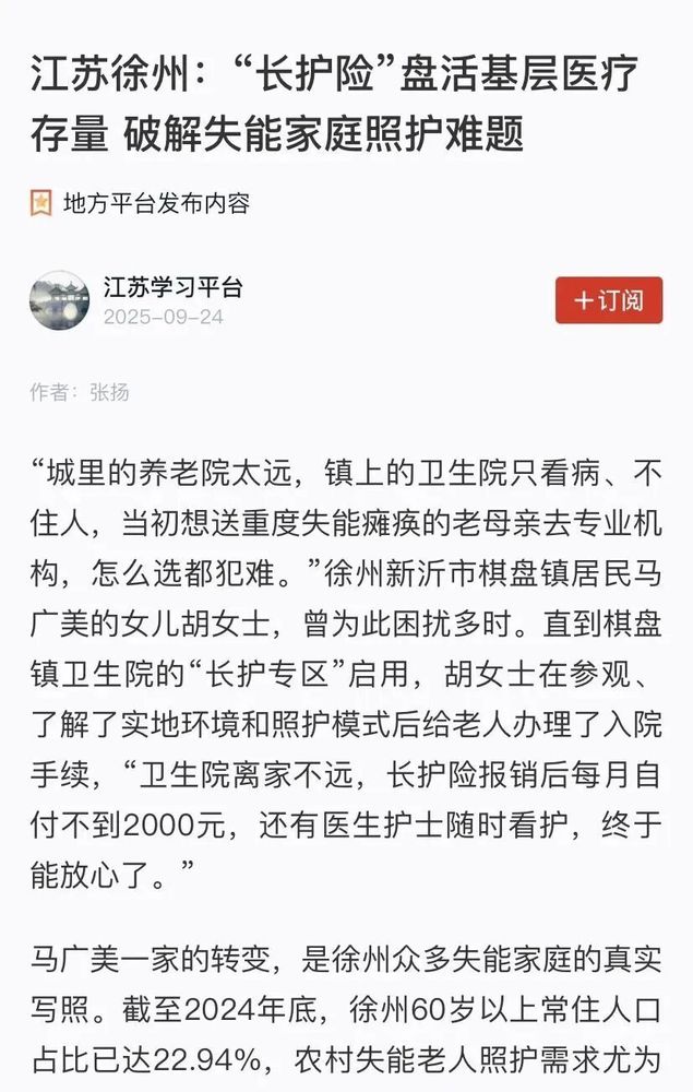 9月24日,“学习强国”江苏学习平台以《江苏徐州:“长护险”盘活基层医疗存量 破解失能家庭照护难题》为题,对我市推动基层长期护理服务供给的经验做法进行报道。 ![]() 全文如下 “城里的养老院太远,镇上的卫生院只看病、不住人,当初想送重度失能瘫痪的老母亲去专业机构,怎么选都犯难。”徐州新沂市棋盘镇居民马广美的女儿胡女士,曾为此困扰多时。直到棋盘镇卫生院的“长护专区”启用,胡女士在参观、了解了实地环境和照护模式后给老人办理了入院手续,“卫生院离家不远,长护险报销后每月自付不到2000元,还有医生护士随时看护,终于能放心了。” 马广美一家的转变,是徐州众多失能家庭的真实写照。截至2024年底,徐州60岁以上常住人口占比已达22.94%,农村失能老人照护需求尤为迫切。而另一方面,不少乡镇卫生院却陷入“病人外流、床位闲置、医护空闲”的窘境。如何实现“老有所护、院有所为”?徐州以长期护理保险(简称“长护险”)为纽带,在全省率先打通基层医疗资源与失能照护需求的对接通道,让“看病的地方”变身“照护的港湾”。 基层医疗添功能 闲置资源“活”起来 “新建一家专业照护机构,基建加设备动辄数百万元,建设周期少说也得一年以上;而改造乡镇卫生院的闲置病房,每张床位仅需添置适老设备,两三个月即可投入使用。”徐州市医疗保险基金管理中心相关负责同志算了一笔“民生账”。作为农业大市,徐州乡镇卫生院闲置床位资源丰富,这些“家门口”的医疗资源,正是破解农村照护难题的关键。 ![]() 为激活闲置资源,徐州合理优化调整城乡基层医疗卫生资源配置,按照因地制宜、政府主导、分步分类、兜底保障的原则,重点推动医疗资源富余地区的乡镇卫生院转型发展。沛县投入3.7亿元,将8家乡镇卫生院改建为公建公营区域医养中心,全部纳入长护险定点;新沂市则引导8家乡镇卫生院设立独立长护专区,其中6家入住率超80%。如今,徐州已探索形成乡镇卫生院托管养老院、转设护理院、设置长护专区复合发展路径。 专业服务赋能 基层照护显“精度” “不是简单加一张床,而是要实现医疗护理与生活照料‘无缝衔接’。”徐州市医疗保障局党组书记、局长杨晶道出了徐州推动基层医疗机构转型的核心理念。转型后的卫生院,不仅保留慢病防治、基础诊疗等医疗功能,还配备医生、护士、康复治疗师等专业团队,为失能人员提供“慢病管理 康复训练 生活照料”一体化服务。在棋盘镇卫生院长护专区,失能老人不仅能获得进食、翻身等日常照料,还可随时监测血压、血糖,突发情况也能得到及时处置。 ![]() 为提升照护质量,徐州医保还联合多部门构建协同支持体系:长护险按失能等级精准补助,入住医疗机构的重度失能人员每日可享82元基金支付,中度则为51.5元;入住养老机构的重度失能人员长护险基金每日支付42元,中度为31.5元;卫健部门指导机构优化护理方案,确保服务专业规范。“原本担心卫生院不够专业,现在医生每周巡诊、护士每日查房,比在家照料更安心。”入住睢宁医养机构的失能老人家属李女士表示。 科技、制度强监管 守住长护服务“第一关” 老人是否得到妥善照护?基金使用是否规范?申请流程是否繁琐?这些群众关切的问题,徐州通过“科技赋能 制度保障”实现了“双保险”。 徐州开发长护险经办与监管两大系统,将参保确认、申请预审、专家评估、结论出具、结果公示、待遇结算等全流程纳入信息化闭环管理,实现业务受理、失能评估、待遇结算和监管全程一体化、全覆盖。 ![]() 在评估中度、重度失能工作中,徐州医保长护险采取了一系列严格且科学的监管措施。引入专业第三方评估机构,利用其专业技术和中立立场,确保评估的客观性。建立专家库,由副主任医师以上级别的专家组成,为评估提供专业支持与指导,提升评估的权威性和准确性。 同时,引入“盲评”机制:由承办机构安排评估路线与名单,联合评估机构上门鉴定,结果一致方予确认。全程保留影像资料,为评估结果提供回溯依据,进一步规范评估流程。此外,每月定期召开会议,针对有争议的案例共同商讨解决,确保每一个评估结论都经得起检验,最大程度保障参保人员的切身利益。 资源盘活多方共赢 照护服务再延伸 为充分发挥“家庭医生 专科团队”协作模式功效,徐州鼓励村卫生室开展上门服务,引导优质资源下沉。针对接受照护服务机构上门服务的,重度失能人员最高补助标准为900元/月、中度失能人员最高补助标准为600元/月。 徐州还将辅具租赁纳入长护险范畴,医保部门遴选优质供应商,在失能人员提出需求后,由商保公司与专业机构共同上门评估,根据体征、活动能力、居住环境等提供适配辅具,现场讲解使用方法,确保安全无忧。 截至2025年8月,徐州已有36家基层医疗机构纳入长护险协议管理,累计接收失能人员2600余人,长护险基金累计支付3900余万元,带动基层医疗机构实现综合营收超8000万元,曾经“吃不饱”的乡镇卫生院,如今找到新的增长点。一度“照护难”的失能老人,在家门口享受到专业服务。 从激活“沉睡”的医疗资源,到缓解失能家庭的“照护焦虑”,徐州长护险正以更贴心、更专业的服务,为老龄化社会下的“幸福养老”写下温暖注脚。 上一篇: ¥20、¥40、¥100好券派送,速领