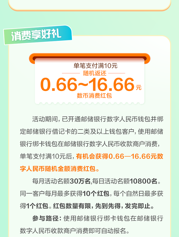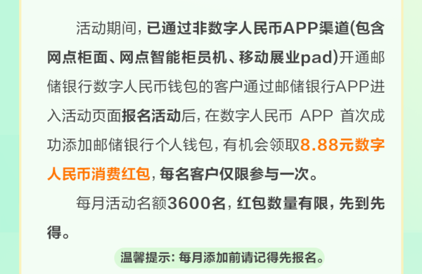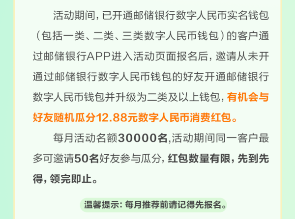 ![]() ![]() ![]() 活动规则 向上滑动阅览 一、活动时间 2025年11月1日00:00:00至2025年11月30日23:59:59 二、活动对象 已通过非数字人民币app渠道(包含网点柜面、网点智能柜员机、移动展业pad)开通邮储银行数字人民币个人钱包且未将邮储银行数字人民币个人钱包添加至数字人民币app的客户 三、活动细则 (一)活动内容 活动期间,已通过非数字人民币app渠道(包含网点柜面、网点智能柜员机、移动展业pad)开通邮储银行数字人民币钱包的客户通过邮储银行app进入活动页面报名活动后,在数字人民币 app 首次成功添加邮储银行个人钱包,有机会领取8.88元数字人民币消费红包,每名客户仅限参与一次。每月活动名额3600名,红包数量有限,先到先得,领完即止。 (二)参与流程 1.活动报名 符合活动参与条件的客户,进入邮储银行app【数字人民币专区】-【生活】,点击【体验任务】,进入任务页面,在任务列表中查看【数币“邮”心意 添加享好礼】任务,点击【去体验】报名参与活动。 2.钱包添加至数字人民币app (1)符合活动参与条件的客户在活动页面点击【去体验】后,若客户已下载数字人民币app,则跳转到数字人民币app开通或添加数字钱包页面,点击“同意并开通”按钮,输入验证码及钱包支付密码后,完成钱包添加; (2)符合活动参与条件的客户在活动页面点击【去体验】后,若客户未下载数字人民币app,则跳转至下载数字人民币app页,点击立即下载,下载完成后点击新用户注册,输入手机号-注册-输入验证码-设置登录密码-开通或添加数字钱包页面,点击“同意并开通”按钮,输入验证码及钱包支付密码后,完成钱包添加。 3.奖励领取 完成钱包添加至数字人民币app体验任务的客户,返回任务页面有机会获得8.88元数字人民币消费红包。客户可在任务页面【奖励明细】中查看红包奖励,也可在邮储银行app【数字人民币】-【凯发k8娱乐凯发k8娱乐官网app下载官网app下载首页】-【我的红包】或数字人民币app【服务】-【消费红包】中查看红包奖励。 (三)奖励说明 1.消费红包有效期30天。超过有效期未使用的消费红包将回收至活动组织方,不予以补发,请在有效期内及时使用。消费红包不可提现、转赠,可在所有支持数字人民币收款的商户处使用。以上消费红包不可与邮储银行其他数币消费红包叠加使用。 2.本活动奖励仅向报名活动成功、在当月参与并满足活动条件要求的客户发放。活动结束后,不做任何追加奖励,完成任务后请及时查看领取奖励。 (四)其他说明 1.本活动客户仅限为在数字人民币 app 首次成功添加邮储银行个人钱包的客户。 2.符合同一钱包编号、同一手机号、同一身份证号等任一条件的,均视为同一用户,不可重复参加。 3.活动期内,若报名后注销钱包或修改钱包关联手机号,将影响任务完成记录及奖励红包的正常发放。因客户注销钱包或修改钱包关联手机号无法领取奖励的,不予以补发。 4.本活动仅限数字人民币试点地区客户报名参与,数字人民币已在北京,天津,河北省,大连,上海,江苏省,浙江(杭州、宁波、温州、湖州、绍兴、金华),福建(福州、厦门),山东(济南、青岛),长沙,广东省,广西(南宁、防城港),海南省,重庆,四川省,云南(昆明、西双版纳),西安开展试点,试点地区以数字人民币app注册页面显示为准。 四、注意事项 (一)客户存在以下任一情形的,不得参与本活动;已经参与活动的,不予以发放奖励,不可领取奖励;如奖励已发放的,中国邮政储蓄银行股份有限公司有权撤销客户获奖资格,并要求客户返还奖励;情节严重的,中国邮政储蓄银行股份有限公司有权禁止客户参加所有营销活动及追究客户相应的法律责任: 1.客户通过任何不正当手段或以违反诚实信用原则的方式参与活动,或客户存在任何扰乱活动秩序的行为,或客户存在有碍其他客户公平参与本活动的行为;包括但不限于恶意使用多个账号参与本活动,虚假注册和交易,提供虚假交易信息,盗用他人账户,使用虚假手机号,恶意套取奖励,修改设备数据,使用模拟器、插件、外挂、机器人等方式参与活动等; 2.客户存在其他违法违规行为、违约行为或违反诚实信用原则的行为; 3.客户不属于本活动对象。 (二)如因不可抗力、相关政策、活动调整等原因导致本活动调整、暂停或无法进行的,中国邮政储蓄银行股份有限公司在法律允许范围内,可保留调整、暂停和终止本活动的权利,并经活动页面公告后生效。 五、温馨提示 本活动及产品由中国邮政储蓄银行股份有限公司提供,如对本活动存在疑问,可致电邮储银行24小时客服热线95580进行咨询。 ![]() ![]() ![]() 活动规则 向上滑动阅览 一、活动时间 2025年11月1日00:00:00至2025年11月30日23:59:59 二、活动对象 已开通邮储银行数字人民币实名钱包的客户 三、活动细则 (一)活动内容 活动期间,已开通邮储银行数字人民币实名钱包(包括一类、二类、三类数字人民币钱包)的客户通过邮储银行app进入活动页面报名后,邀请从未开通过邮储银行数字人民币钱包的好友开通邮储银行数字人民币钱包并升级为二类及以上钱包,有机会与好友随机瓜分12.88数字人民币消费红包。 每月活动名额30000名,活动期间同一客户最多可邀请50名好友参与瓜分,红包数量有限,先到先得,领完即止。 (二)参与流程 1.活动报名 符合活动参与条件的客户,进入邮储银行app【数字人民币专区】-【生活】,点击【