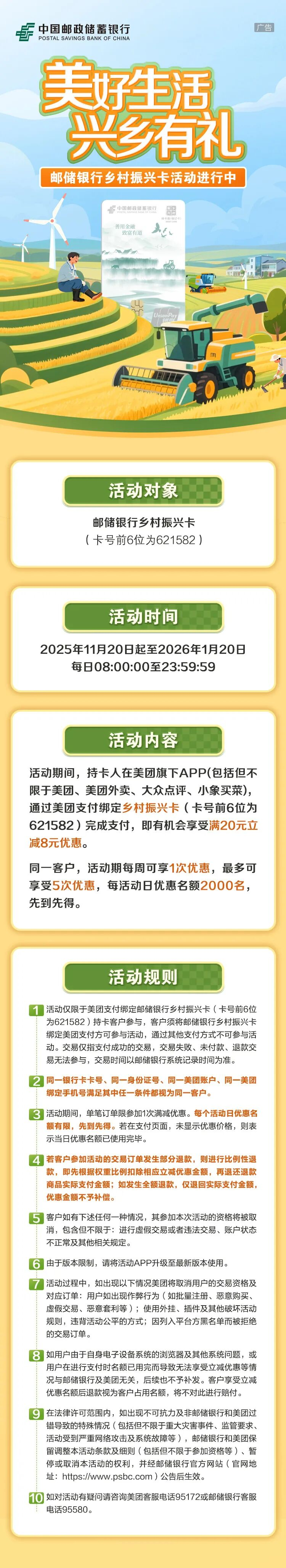 【兴乡有礼】邮储乡村振兴卡专享,美团支付满20立减8元! -凯发k8娱乐官网app下载