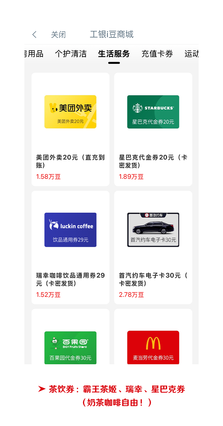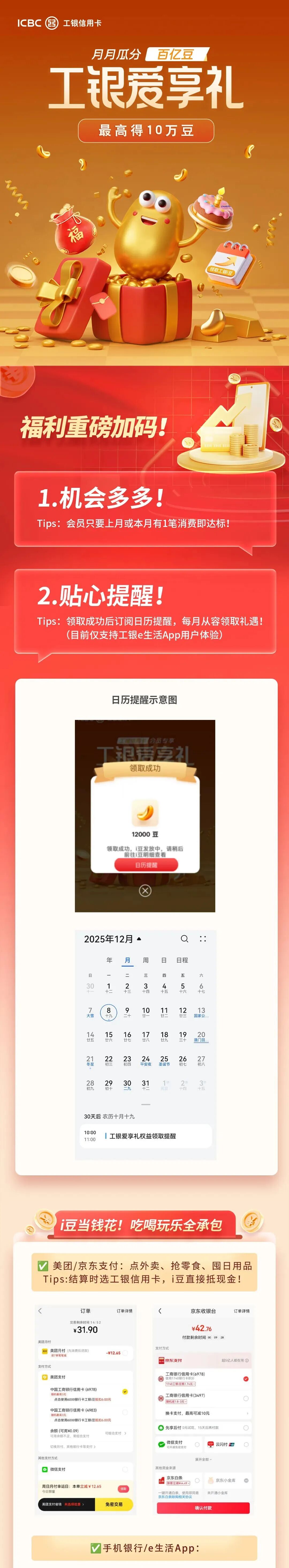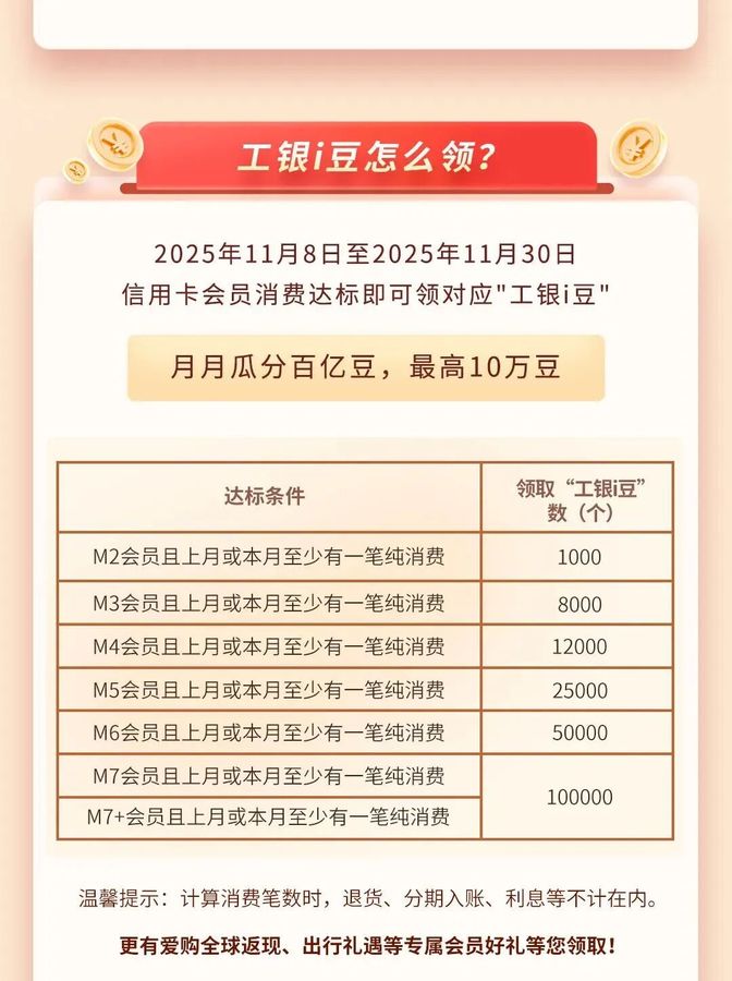 ![]() ![]() ![]() ![]() ![]() ![]() ![]() ![]() ![]() ![]() 向上滑动阅览 工银爱享礼各礼遇规则 活动时间 2025年11月8日10:00起 至 2025年11月30日23:59:59 活动对象 工银信用卡有消费客户 活动内容 (1)成长增豆 m2-m4信用卡会员且上月(10月)或本月至少有一笔消费客户每月有机会领取工银i豆回馈,具体内容为:m2客户每月有机会领取1000豆;m3客户每月有机会领取8000豆;m4客户每月有机会领取1.2万豆。名额有限,先到先得。 温馨提示:上月或本月至少有一笔消费判断时:1.消费不包含分期入账、手续费、利息、退货等,具体以系统判定为准;2.系统判定持卡人当月消费笔数达标需要1-4个自然日,楼层页会显示【达标后领奖资格判断预计1-4日,具体以活动页面显示为准】 (2)月月豆涨 m5及以上信用卡会员且上月(10月)或本月至少有一笔消费每月有机会领取工银i豆回馈。其中m5客户每月有机会领取2.5万豆;m6客户每月有机会领取5万豆;m7及m7 客户每月有机会领取10万豆。名额有限,先到先得。 温馨提示:上月或本月至少有一笔消费判断时:1.消费不包含分期入账、手续费、利息、退货等,具体以系统判定为准;2.系统判定持卡人当月消费笔数达标需要1-4个自然日,楼层页会显示【达标后领奖资格判断预计1-4日,具体以活动页面显示为准】 ![]() (3)专属权益 专属权益内各活动以进入活动专区内细则显示为准。 活动细则 (一)同一身份证号、银行卡号、手机设备、手机号码,满足其中任意一个条件均视为同一客户。 (二)工银i豆相关说明。 1.通过“工银爱享礼”活动领取的工银i豆有效期为1年。每年12月底到期的“工银i豆”具体到期日为12月30日,其他月份到期的“工银i豆”具体到期日为到期当月最后一日。例如,2025年6月发放的消费积分转换为“工银i豆”后,在2026年6月30日(含)之前有效。 2.“工银i豆”可在中国工商银行手机银行“工银i豆”商城、工银e 生活app及e生活小程序“工银i豆”商城、指定特约商户和指定第三方平台等渠道兑换。具体兑换项目、兑换标准及兑换规则以各渠道兑换详情页面展示为准。可登录中国工商银行手机银行-我的-工银i豆或工银e生活-工银i豆查看具体情况。 (三)卡片被冻结、止付、收卡、销户,或发生欺诈、套现、逾期还款、对中国工商银行其他债务不偿还的、发生或涉嫌发生从事违法、违规、违反牡丹信用卡章程、领用合约或本活动办法及其他相关规定等情形的,即丧失参加本活动的资格,中国工商银行具有告知客户并采取相应法律措施的权利。 (四)根据业务发展、市场变化等原因,我行可动态调整活动容,具体以页面展示为准。 (五)各项购买的礼品/服务以服务详情页面规则的使用流程及相关第三方平台使用规则为准,一经领取或购买成功,除有特别说明、处理失败以外原则上不可取消、退还或更换,请务必在兑换前仔细确认订单内容。 (六)在中国法律许可范围内我行有权修改相关规则,包括但不限于活动时间、客户参加资格、回馈规则、奖励名额以及本规则其他内容、暂停或终止本活动,并按照法律法规及相关监管规定要求,经相关途径(如网站等)公告后生效。 (七)如有问题,可通过营业网点、门户网站或中国工商银行手机银行app在线客服咨询或拨打95588。 (八)我行与礼品/服务供应商间无合伙、经销、代理关系或共用出售人或保证人关系,本活动供应商所提供的礼品或服务的有关责任及凯发k8娱乐官网app下载的售后服务有关争议、纠纷等由各供应商负责。 ![]()