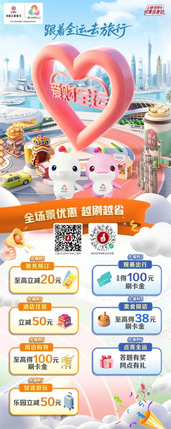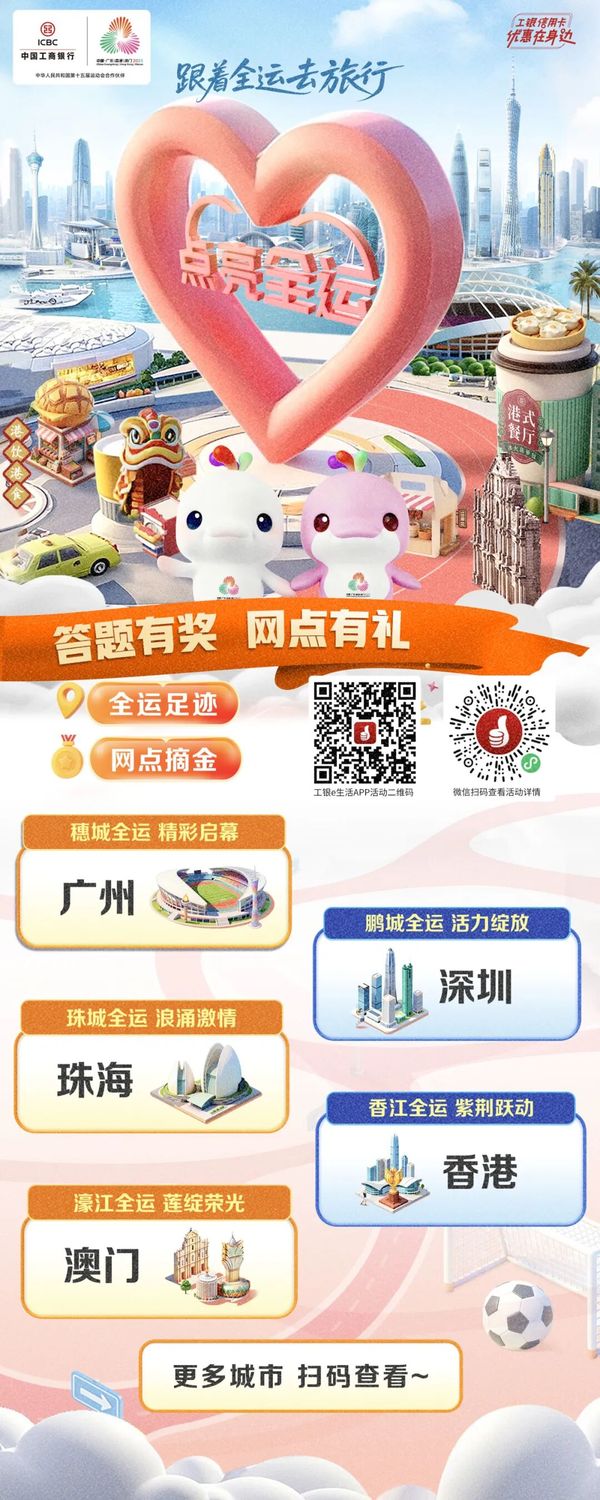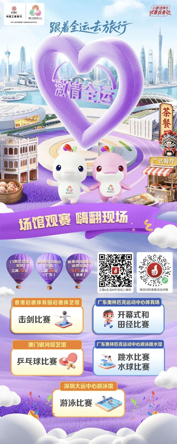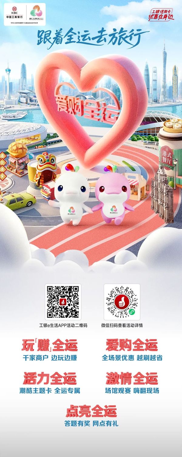 党的二十届四中全会提出,建设强大国内市场,加快构建新发展格局。工商银行认真贯彻落实党中央决策部署,以第十五届全运会(以下简称“十五运会”)举办为契机,深耕文化、体育、旅游消费新场景,通过“场景融通、权益下沉、服务升级”三维联动,将金融服务嵌入赛事、文旅、民生全链条,为粤港澳大湾区融合发展注入活力。 ![]() 锚定“全运 ”生态 构建消费服务新生态 工商银行聚焦十五运会“粤港澳三地联动”办赛特色,进一步延展“文体旅”场景服务半径,打造“赛事引流、消费承接、服务沉淀”的全周期服务生态。围绕客户“观赛、美食、文旅”三大核心需求,工商银行深度挖掘承办与联动城市资源,精心策划“跟着全运去旅行”主题活动,覆盖广州塔、澳门文旅地标、香港特色商圈、顺德美食街巷等热门场景在内的52条全运主题旅行线路,并遴选1000家优质收单商户组建“全运消费联盟”,涵盖赛事场馆便利店、特许商店、餐饮商超、文化场所等,实现“观赛有优惠、出行有便利、消费有实惠”的全场景覆盖。 ![]() 创新产品与服务 提升消费体验 01 在产品创新层面 工商银行推出“全运会纪念版粤港澳湾区信用卡”,卡面融合全运赛事吉祥物元素,兼具收藏价值与潮流属性;针对港澳居民及外籍来华观赛人士,优化“卡码通”极速申领服务,支持口岸、酒店、赛场等场景便捷刷卡,畅通跨境支付渠道,切实提升跨境消费体验。 ![]() 02 在权益设计层面 工商银行围绕观赛全流程打造分层优惠体系。赛事票务环节,联合官方平台推出信用卡购票满减优惠;出行住宿环节,联动第三方平台提供机票、火车票、打车满减及酒店预订叠加i豆抵现;本地消费环节,基于各城市外卖、餐饮、购物等特色场景,通过“支付返现、满额立减”等方式降低消费成本,让持卡人“观赛省心、消费省钱”。 ![]() 完善线上线下服务 打造消费增长新引擎 工商银行在手机银行推出全运专区,依托“工银e生活”app、“e生活plus”小程序搭建“点亮全运”互动平台,嵌入赛事信息、全运知识答题和优惠活动。聚焦热门商圈、赛事场馆等重点场景优化服务布局,联动合作商户打造“全运特色打卡点”。针对热门赛事场次、高频消费场景加大优惠力度,加码场馆周边餐饮、购物商户优惠,助力将赛事热度转化为消费动能。 ![]() 此外,工商银行在大湾区约1500家网点开设“全运服务绿色通道”,并通过“工行全运驿站”为志愿者、市民及观众提供暖心服务,传递“活力工行”服务温度。 ![]() 下一篇: 刘珺出席第二届中德金融界圆桌会