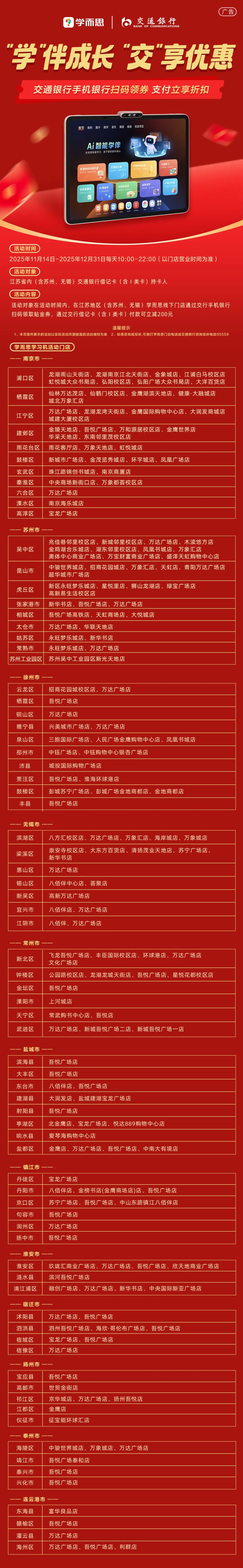 江苏地区(含苏州、无锡)交行借记卡持卡人至学而思活动门店线下消费即可领取一张200元贴金券(满3000元可用)。活动门店请见下图: