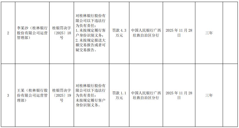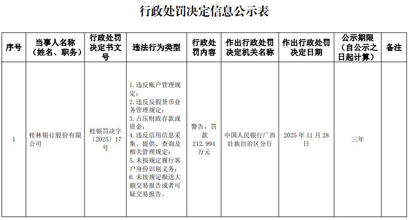 近日,中国人民银行广西壮族自治区分行发布的行政处罚决定信息显示,桂林银行因六项违规行为被警告并罚款212.994万元。同时,该行运营管理部两名员工对相关违规行为负有责任,分别被处以4.3万元和1.1万元罚款。 ![]() ![]() 此次罚单直指银行核心业务环节,桂林银行违法行为类型包括:1.违反账户管理规定;2.违反反假货币业务管理规定;3.占压财政存款或资金;4.违反信用信息采集、提供、查询及相关管理规定;5.未按规定履行客户身份识别义务;6.未按规定报送大额交易报告或者可疑交易报告。 该行运营管理部李某沙对未按规定履行客户身份识别义务、未按规定报送大额交易报告或者可疑交易报告等违法行为负有责任;王某则对未按规定履行客户身份识别义务的违法行为负有责任。 值得注意的是,作为广西资产规模最大的城商行,桂林银行今年来并非首次被监管处罚。 今年9月,桂林银行股份有限公司梧州分行因贷款风险分类不准确、贷后管理不尽职,被国家金融监督管理总局梧州监管分局罚款50万元;11月7日,因基金销售业务存在业务负责人等未取得基金从业资格,未对宣传海报出具合规意见书以及个别基金销售宣传海报未突出风险提示等情况,被广西证监局采取出具警示函的行政监管措施;11月24日,桂林银行股份有限公司贺州分行因违反外汇登记管理规定,被国家外汇管理局贺州市分局罚款5万元;11月28日,桂林银行桂林分行因违反外汇登记管理规定,被国家外汇管理局广西分局罚款10万元。 若叠加12月本次处罚,今年以来桂林银行合计罚款金额达278万元。 凯发k8娱乐官网app下载官网显示,桂林银行成立于1997年,是一家具有独立法人资格的国有控股银行,经过多年发展,已经成为目前广西资产规模最大、经营特色鲜明、核心竞争力突出、品牌形象良好、团队精干高效的单一地方法人金融机构。该行是广西首家资产规模突破5000亿元的城商行,位列“2025年全球银行1000强”第268位、“2025年中国银行业100强”第55位、“2025广西企业100强”第21位,2023年、2024年连续两年获评双“aaa”主体最高信用评级。 桂林银行2025年第三季度报告显示,该行资产规模突破6000亿元大关。截至2025年9月末,桂林银行并表资产总额6056.21亿元,各项存款余额4061.01亿元,各项贷款余额3901.49亿元。 但该行营收和净利润却出现同比下滑。2025年1-9月,该行实现营业收入92.91亿元,同比下滑2.45%;实现净利润21.01亿元,同比降幅扩大至7.58%。 与此同时,资产质量方面桂林银行面临压力。近三年来,该行不良贷款率持续上升目前已远高于城商行同期平均水平。根据同花顺数据,已发布今年三季报的33家城商行不良贷款率均值为1.38%,桂林银行的不良贷率已经上升到1.94%,比均值高出0.56个百分点。 拨备覆盖率降至120%,踩在监管红线上。 资本充足率全面下滑,更是桂林银行面临的棘手问题。2025年三季度,该行资本充足率、一级资本充足率、核心一级资本充足率三项指标全线下滑,分别降至11.46%、10.47%、8.4%,较去年底分别下降了0.28、0.06、0.34个百分点。这对于一家怀揣ipo梦想的银行而言,无疑是一个关键的制约因素。 同时,该行高层管理团队变动频繁。今年9月,桂林银行原董事长吴东因严重违纪违法被查处。近期,该行监事长拟转入董事会,一名80后行长助理也递交了辞呈。 值得一提的是,今年是桂林银行争取上市的第14个年头。早在2011年,时任桂林银行董事长王能首次提出“争取5年内上市”的目标。2015年,桂林银行谋求新三板上市,随后又撤回申请,并表示“希望在条件成熟时直接争取主板上市”。 目前,桂林银行正处在上市辅导备案期。据2025年4月中信证券发布的《关于桂林银行股份有限公司首次公开发行股票并上市辅导工作进展情况报告(第七期)》披露,桂林银行在2025年1-3月辅导期内存在的两大主要问题:一是因历史原因,桂林银行存在少量自有房产土地未办理权证、部分租赁房产未备案登记等情况,需进一步完善相关权属手续;二是桂林银行作为原告涉及若干未决的法律诉讼。 如今,时间过去十余载,桂林银行的ipo之路依旧悬而未决,状况百出。