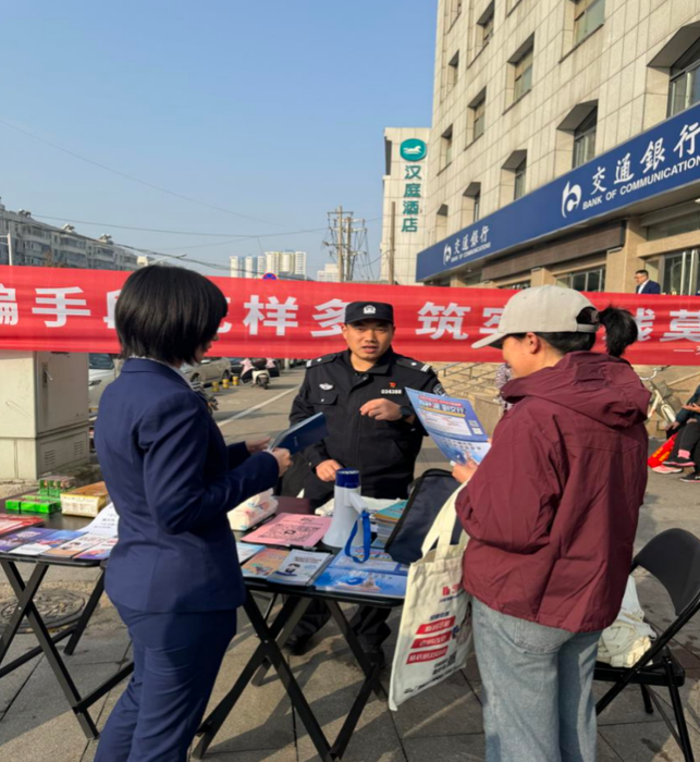 为切实提升辖区居民防范电信网络诈骗的意识和能力,守护好人民群众的“钱袋子”,近日,交通银行徐州分行营业部与王陵派出所、王陵街道办事处联合举办以“反诈同行,平安相伴”为主题的防范电信网络诈骗宣传活动。此次活动通过面对面宣讲、派发宣传品等形式,将反诈知识送到居民身边,获得现场群众的一致好评。 活动当天,该行工作人员与王陵派出所的民警、街道办事处的志愿者们紧密配合,向过往居民详细讲解当前高发的如“刷单返利”“虚假投资”“冒充公检法”“网络贷款”等诈骗类型,结合真实案例,生动剖析诈骗分子的常用话术和作案手法,让居民们听得懂、记得住、用得上。 “这份折页里有防骗口诀和各种反诈案例,这个帆布包上也印着反诈提示,大家平时买菜、逛街都能用上,随时看一眼,给心里提个醒!”活动现场,主办方向居民们免费派发精心制作的反诈宣传折页和印有反诈知识的环保帆布包,将反诈知识变为移动的“反诈课堂”。