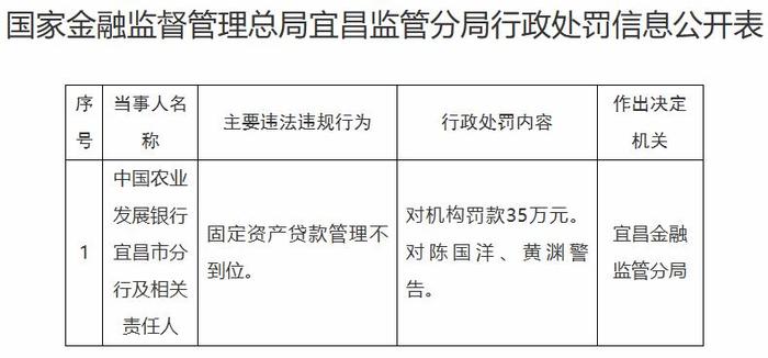 12月12日,国家金融监督管理总局宜昌监管分局披露的行政处罚信息公开表显示,因固定资产贷款管理不到位,中国农业发展银行宜昌市分行被罚35万元。