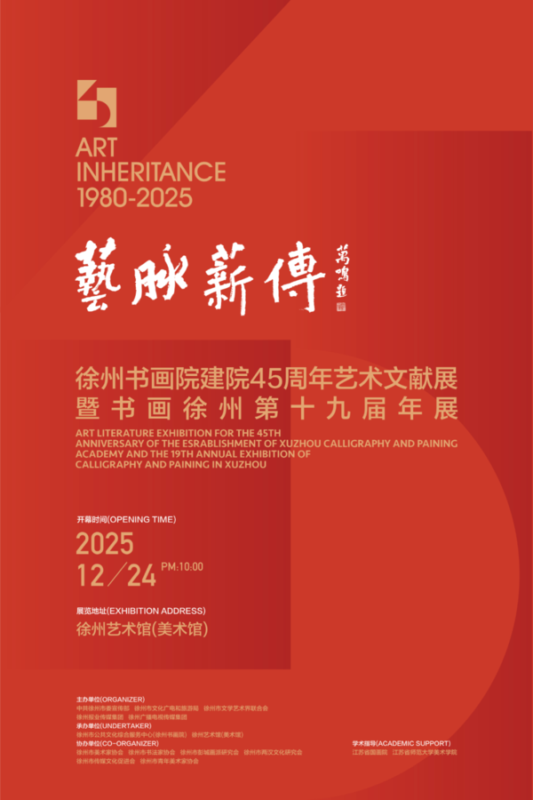 四十五周年深耕艺苑,薪火相传; 十九届展览迭呈佳构,初心未改。 尊敬的各位朋友,我们郑重向您宣布,艺脉薪传(1980-2025)——徐州书画院建院45周年艺术文献展暨“书画徐州”第十九届年展将于12月24日(星期三)上午十时在徐州艺术馆隆重启幕,届时欢迎您的莅临! 这不仅是一场展览,更是一次跨越四十五年的对话。历时半年筹备,将以“文献 艺术”的双重脉络,通过一部院史、三代笔墨,为您呈现笔墨背后、岁月深处的徐州书画院发展史。 ![]() 主办单位 中共徐州市委宣传部 徐州市文化广电和旅游局 徐州市文学艺术界联合会 徐州报业传媒集团 徐州广电传媒集团 承办单位 徐州市公共文化综合服务中心 (徐州书画院) 徐州艺术馆(美术馆) 协办单位 徐州市美术家协会 徐州市书法家协会 徐州市彭城画派研究会 徐州市两汉文化研究会 徐州市传统文化促进会 徐州市青年美术家协会 学术支持 中国国家画院 江苏省国画院 江苏师范大学美术学院 展览时间 2025年12月24日—2026年1月6日 开幕时间 2025年12月24日 上午10:00 展览地点 徐州艺术馆(美术馆) (泉山区湖北路7号)