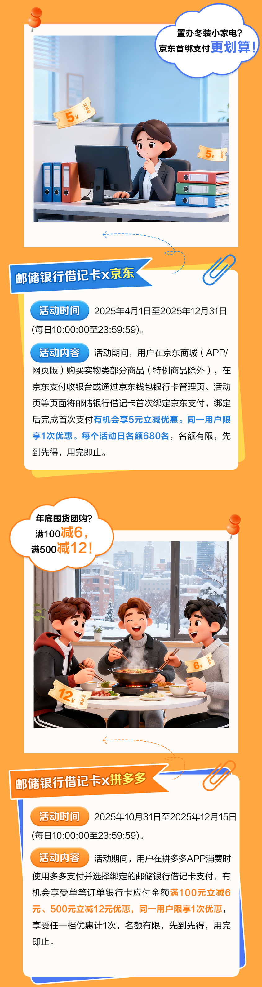 ![]() ![]() ![]() 一、中国邮政储蓄银行借记卡抖音支付首绑立减5元活动细则 1.请用户仔细阅读并充分理解本活动规则的全部内容(特别是以粗体标注的内容)后再参与本活动,如有疑问请致电邮储银行客服与投诉热线95580或抖音客服电话95766进行咨询。 2.红包、转账、提现、零钱充值等非消费场景交易不属于本次活动定义的支付范围。 3.用户须在抖音平台消费时选择抖音支付并使用邮储银行借记卡支付方可享受专享权益。 4.商品最终优惠金额以用户实际支付时收银台展示为准,如支付页面未显示优惠金额或显示未立减的支付金额,则表示当天活动名额已使用完。每个活动日名额1020名,先到先得,用完即止。 5.同一用户指同一个登录账号、同一个设备、同一个手机号、同一个身份证号等与用户身份相关的信息,其中任意一项或数项存在相同、相似、通过特定标记形成批量信息、或其他非真实有效等情形的,经排查认定多个账号的实际控制人为同一人的,均将被认定为同一用户,按活动规则中的同一用户处理。 6.请用户将抖音用户端升至最新版本再参与本活动,以免因版本过低而无法享受活动优惠,安卓用户可通过“抖音-我-侧边栏-设置-通用设置-检查更新”或者应用商店进行升级操作,苹果用户可通过app store-搜索抖音进行升级操作。 7.由于用户电子设备不支持、系统未更新到最新版本,抖音用户端未升至最新版本、卡片挂失等自身原因导致无法享受优惠的,权益不予补发。 8.抖音支付银行卡活动优惠不可用于跨境商品,如订单中含有跨境商品,整个订单均不支持使用抖音支付银行卡优惠。抖音支付银行卡活动优惠仅可在部分抖音支付合作商家/商品使用。 9.立减权益仅在活动期间可使用。用户需要在页面展示的计划活动时间开始后提交订单,活动开始时间之前或活动结束后发起支付或进入收银台界面的,不能享受活动优惠(订单交易时间以抖音系统支付成功时间为准)。 10.活动优惠金额部分不可找零,不可转让,不可兑换现金。如发生退货、撤销或其他不成功交易均不享受优惠。 11.用户使用立减权益后如交易发生退款或部分退款,仅退回持卡人在退款商品上的实际支付金额,立减权益部分不会退回,且立减权益失效,不可再次使用,退款经平台审核后原路退回。 12.如用户存在违背诚实信用原则、违规行为(包括但不限于恶意套取资金、机器作弊、虚假交易等违反诚实信用原则行为)、以参与营销活动或使用营销工具所获得的优惠权益进行盈利或非法获利、当前账户欠款逾期、账户状态不正常等情况,或者抖音平台有合理理由怀疑用户存在不当使用优惠工具或优惠权益的,主办方将取消用户的活动参与资格,并有权撤销相关违规交易、收回优惠权益(含已使用及未使用的),必要时将追究用户的法律责任。用户违背诚实信用原则的行为或经抖音平台合理怀疑存在违背诚实信用原则的行为,包括但不限于如下情况: (1)通过任何不正当手段或以违反诚实信用原则的方式参与活动的,如通过与其他用户、商家串通或利用机器等方式进行作弊、刷取活动道具或积分等扰乱活动秩序的行为; (2)通过任何不正当手段或以违反诚实信用原则的方式达成交易的,如利用秒杀器等工具下单、套取优惠利差、虚假下单交易、提供虚假交易信息等扰乱活动秩序、违反交易规则的行为; (3)用户欠缺交易意愿,如利用退款流程的便利性以实现获取优惠权益目的,交易后出现大量退款的; (4)其他违反诚实信用原则的行为。 13.如出现不可抗力或情势变更的情况(包括但不限于重大灾害事件、活动受政府机关指令需要停止举办或调整的、活动遭受严重网络攻击或因非活动主办方原因产生系统故障需要暂停举办的),活动主办方有权暂停或取消本次活动,并可依相关法律法规的规定主张免责。 14.在法律法规允许范围内,本次活动规则如有调整,以邮储银行官方网站(www.psbc.com)公告为准。 二、中国邮政储蓄银行借记卡首绑京东支付立减5元活动细则 1.请用户仔细阅读并充分理解本活动规则的全部内容(特别是以粗体标注的内容)后参与活动,如有疑问请致电邮储银行客服与投诉热线95580或京东金融客服热线95118进行咨询。 2.单笔订单仅可享受一种银行卡支付优惠,可与京东商城结算页京豆、京东e卡、东券、京券叠加使用。商品最终优惠金额以用户实际支付时收银台展示为准,如收银台展示优惠金额与活动优惠金额不一致,请在付款前联系京东金融客服;如未展示优惠金额,则代表优惠名额已享用完毕。 3.在本活动时间内,同一账户、同一身份证号、同一银行卡号、同一手机号码、同一设备号等与用户身份相关的信息,其中任意一项或者多项存在相同、相似或非真实有效等情况的,均被认定为同一用户,按照营销活动规则中的同一用户处理。 4.用户需要在页面展示的计划活动时间开始后提交订单,或提前下单后在活动时间开始后选择“我的订单”使用邮储银行借记卡完成订单支付,方能参与活动。活动开始时间之前或活动结束后发起支付或进入收银台界面的,不能享受活动优惠(订单交易时间以京东商城系统支付成功时间为准)。 5.用户只有在单独使用邮储银行借记卡支付的情况下才能享受活动优惠。 6.大药房商品、节能补贴类商品、预售类商品、邮币、礼品卡类商品、礼品类商品、文化收藏类商