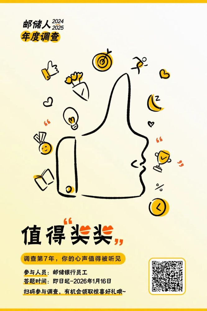 邮储人专属年度时刻来啦! let's do the research ! 从2018到2024 我们共同完成了6次 「邮储人年度调查」 每年的年度调查 都是一场温暖的“双向奔赴” 每一份反馈 都成了我们变得更好的养分! 过去,你的期待都有被我们郑重接住! 这次,你的心里话更值得大声讲讲! “奖”给奋斗的自己 “讲”出真实的心声 2024—2025年度 邮储人年度调查正式启动! 您的每一个选择和回应 都会成为我们一起变得更好的理由! ![]() ![]() 扫描上方二维码 或点击底部阅读原文 即可参与邮储人年度调查 (建议使用手机移动网络填答) 调查时间 即日起—2026年1月16日 参与人员 全行邮储人 郑重承诺 【完全匿名】 所有回答均无法追踪个人身份 请放心畅所欲言! 【无标准答案】 你的真实感受就是最有价值的反馈 无需顾虑对错~ 奖品福利 填完问卷后记得参与抽奖 有机会抽取我们准备的奖品哦! ![]() 超级植物许愿树盲盒1个 2024—2025 邮储人年度调查 这是我们第7年倾听彼此的心声 属于我们的年度对话,这次别错过! 快来参与调查吧~ #投稿邮箱:psbcgh@qq.com#