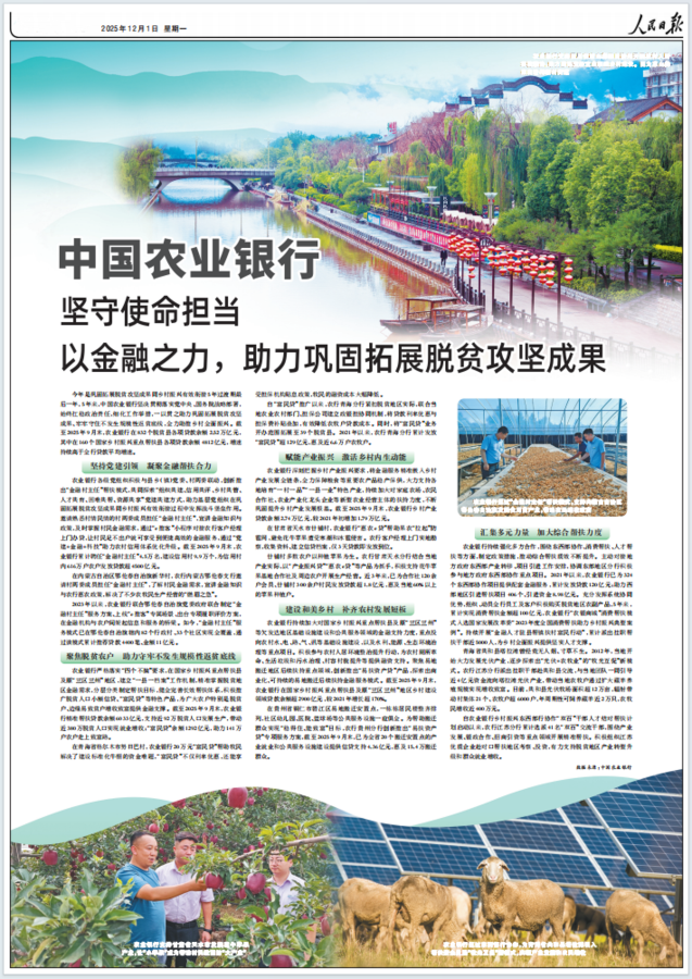 今日,《人民日报》刊发《中国农业银行坚守使命担当 以金融之力,助力巩固拓展脱贫攻坚成果》,报道农业银行助力巩固拓展脱贫攻坚成果,以金融之力助推乡村全面振兴。 ![]() 今年是巩固拓展脱贫攻坚成果同乡村振兴有效衔接5年过渡期最后一年,5年来,中国农业银行坚决贯彻落实党中央、国务院战略部署,始终扛稳政治责任,细化工作举措,一以贯之助力巩固拓展脱贫攻坚成果、牢牢守住不发生规模性返贫底线,全力助推乡村全面振兴。截至2025年9月末,农业银行在832个脱贫县各项贷款余额2.52万亿元,其中在160个国家乡村振兴重点帮扶县各项贷款余额4812亿元,增速持续高于全行贷款平均增速。 坚持党建引领 凝聚金融帮扶合力 农业银行各级党组织积极与县乡(镇)党委、村两委联动,创新推出“金融村主任”帮扶模式,共同探索“组织共建、信用共评、乡村共管、人才共育、困难共帮、资源共享”党建共建方式,助力基层党组织在巩固拓展脱贫攻坚成果同乡村振兴有效衔接过程中发挥战斗堡垒作用。邀请熟悉村情民情的村两委成员担任“金融村主任”,宣讲金融知识与政策,及时掌握村民金融需求,通过“e推客”小程序对接农行客户经理上门办贷,让村民足不出户就可享受到便捷高效的金融服务,通过“党建 金融 科技”助力农村信用体系优化升级。截至2025年9月末,农业银行累计聘任“金融村主任”4.5万名,建设信用村9.9万个,为信用村内616万户农户发放贷款超4500亿元。 在内蒙古自治区鄂伦春自治旗新华村,农行内蒙古呼伦贝尔鄂伦春支行邀请村两委成员担任“金融村主任”,了解村民金融需求,宣讲金融知识与农行惠农政策,解决了不少农牧民生产经营的“燃眉之急”。 ![]() ▲农业银行通过“金融村主任”帮扶模式,支持内蒙古鄂伦春自治旗发展食用菌产业,带动农民增收致富 2023年以来,农业银行联合鄂伦春自治旗党委政府联合制定“金融村主任”服务方案、上线“e推客”专属场景、出台专项履职评价方案,在金融机构与农户间架起信息和服务的桥梁。如今,“金融村主任”服务模式已在鄂伦春自治旗辖内82个行政村、33个社区实现全覆盖,通过该模式累计推荐贷款4400笔、金额11亿元。 聚焦脱贫农户 助力守牢不发生规模性返贫底线 农业银行严格落实“四个不摘”要求,在国家乡村振兴重点帮扶县及原“三区三州”地区,建立“一县一档案”工作机制,精准掌握脱贫地区金融需求,分层分类制定帮扶目标,健全完善长效帮扶体系,积极推广脱贫人口小额信贷、“富民贷”等特色产品,为广大农户特别是脱贫户、边缘易致贫户增收致富提供金融支撑。截至2025年9月末,农业银行精准帮扶贷款余额6033亿元,支持近92万脱贫人口发展生产,带动近380万脱贫人口实现就业增收;“富民贷”余额1292亿元,助力141万户农户走上致富路。 在青海省格尔木市努日巴村,农业银行20万元“富民贷”帮助牧民解决了建设标准化牛棚的资金难题,“富民贷”不仅利率优惠,还能享受担保机构贴息政策,牧民的融资成本大幅降低。 自“富民贷”推广以来,农行青海分行紧扣脱贫地区实际,联合当地农业农村部门、担保公司建立政银担协同机制,将贷款利率优惠与担保费补贴叠加,有效降低农牧户贷款成本。同时,将“富民贷”业务开办范围拓展至39个脱贫县。2021年以来,农行青海分行累计发放“富民贷”超129亿元,惠及近6.6万户农牧户。 赋能产业振兴 激活乡村内生动能 农业银行深刻把握乡村产业振兴要求,将金融服务精准嵌入乡村产业发展全链条,全力保障粮食等重要农产品稳产保供,大力支持各地培育“一村一品”“一县一业”特色产业,持续加大对家庭农场、农民合作社、农业产业化龙头企业等新型农业经营主体的扶持力度,不断巩固提升乡村产业发展根基。截至2025年9月末,农业银行乡村产业贷款余额2.74万亿元,较2021年初增加1.79万亿元。 在甘肃省天水市廿铺村,农业银行“惠农e贷”帮助果农“拉起”防雹网,避免花牛苹果遭受寒潮和冰雹侵害。农行客户经理上门实地勘察,收集资料、建立信贷档案,仅3天贷款即发放到位。 廿铺村多数农户以种植苹果为生。农行甘肃天水分行结合当地产业实际,以“产业振兴贷”“惠农e贷”等产品为抓手,积极支持花牛苹果基地合作社及周边农户开展生产经营。近3年来,已为合作社120余户会员、廿铺村300余户村民发放贷款超1.8亿元,惠及当地60%以上的苹果种植户。 ![]() ▲农业银行支持甘肃天水发展花牛苹果产业,让“小苹果”成为带动村民致富的“大产业” 建设和美乡村 补齐农村发展短板 农业银行持续加大对国家乡村振兴重点帮扶县及原“三区三州”等欠发达地区基础设施建设和公共服务领域的金融支持力度,重点投向农村水、电、路、气、讯等基础设施建设,以及水利、能源、生态环境治理等重点项目。积极参与农村人居环境整治提升行动,为农村厕所革命、生活垃圾和污水治理、村容村貌提升等提供融资支持。聚焦易地搬迁地区后续扶持重点领域,创新推出“易扶资产贷”产品,探索出商业化、可持续的易地搬迁后续扶持金融服务模式。截至2025年9月末,农业银行在国家乡村振兴重点帮扶县及原“三区三州”地区乡村建设领域贷款余额超2900亿元,较2021年增长超170%。 ![]() ▲农业银行支持四川凉山开展农村人居环境整治,助力当地宜