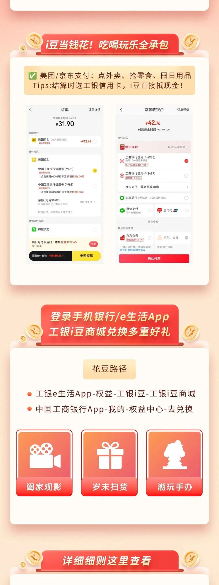 ![]() ![]() ![]() ![]() 向上滑动阅览 工银爱享礼各礼遇规则 活动时间 2025年12月8日10:00起 至 2025年12月31日23:59:59 活动对象 工银信用卡有消费客户 活动内容 (1)成长增豆 m2-m4信用卡会员且上月(11月)或本月至少有一笔消费客户每月有机会领取工银i豆回馈,具体内容为:m2客户每月有机会领取1000豆;m3客户每月有机会领取8000豆;m4客户每月有机会领取1.2万豆。名额有限,先到先得。 温馨提示:上月或本月至少有一笔消费判断时:1.消费不包含分期入账、手续费、利息、退货等,具体以系统判定为准;2.系统判定持卡人当月消费笔数达标需要1-4个自然日,楼层页会显示【达标后领奖资格判断预计1-4日,具体以活动页面显示为准】 (2)月月豆涨 m5及以上信用卡会员且上月(11月)或本月至少有一笔消费每月有机会领取工银i豆回馈。其中m5客户每月有机会领取2.5万豆;m6客户每月有机会领取5万豆;m7及m7 客户每月有机会领取10万豆。名额有限,先到先得。 温馨提示:上月或本月至少有一笔消费判断时:1.消费不包含分期入账、手续费、利息、退货等,具体以系统判定为准;2.系统判定持卡人当月消费笔数达标需要1-4个自然日,楼层页会显示【达标后领奖资格判断预计1-4日,具体以活动页面显示为准】 ![]() (3)专属权益 专属权益内各活动以进入活动专区内细则显示为准。 活动细则 (一)同一身份证号、银行卡号、手机设备、手机号码,满足其中任意一个条件均视为同一客户。 (二)工银i豆相关说明。 1.通过“工银爱享礼”活动领取的工银i豆有效期为1年。每年12月底到期的“工银i豆”具体到期日为12月30日,其他月份到期的“工银i豆”具体到期日为到期当月最后一日。例如,2025年6月发放的消费积分转换为“工银i豆”后,在2026年6月30日(含)之前有效。 2.“工银i豆”可在中国工商银行手机银行“工银i豆”商城、工银e 生活app及e生活小程序“工银i豆”商城、指定特约商户和指定第三方平台等渠道兑换。具体兑换项目、兑换标准及兑换规则以各渠道兑换详情页面展示为准。可登录中国工商银行手机银行-我的-工银i豆或工银e生活-工银i豆查看具体情况。 (三)卡片被冻结、止付、收卡、销户,或发生欺诈、套现、逾期还款、对中国工商银行其他债务不偿还的、发生或涉嫌发生从事违法、违规、违反牡丹信用卡章程、领用合约或本活动办法及其他相关规定等情形的,即丧失参加本活动的资格,中国工商银行具有告知客户并采取相应法律措施的权利。 (四)根据业务发展、市场变化等原因,我行可动态调整活动容,具体以页面展示为准。 (五)各项购买的礼品/服务以服务详情页面规则的使用流程及相关第三方平台使用规则为准,一经领取或购买成功,除有特别说明、处理失败以外原则上不可取消、退还或更换,请务必在兑换前仔细确认订单内容。 (六)在中国法律许可范围内我行有权修改相关规则,包括但不限于活动时间、客户参加资格、回馈规则、奖励名额以及本规则其他内容、暂停或终止本活动,并按照法律法规及相关监管规定要求,经相关途径(如网站等)公告后生效。 (七)如有问题,可通过营业网点、门户网站或中国工商银行手机银行在线客服咨询或拨打95588。 (八)我行与礼品/服务供应商间无合伙、经销、代理关系或共用出售人或保证人关系,本活动供应商所提供的礼品或服务的有关责任及凯发k8娱乐官网app下载的售后服务有关争议、纠纷等由各供应商负责。 ![]()
