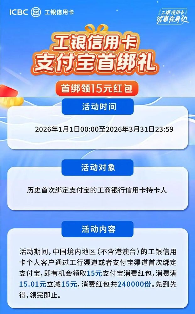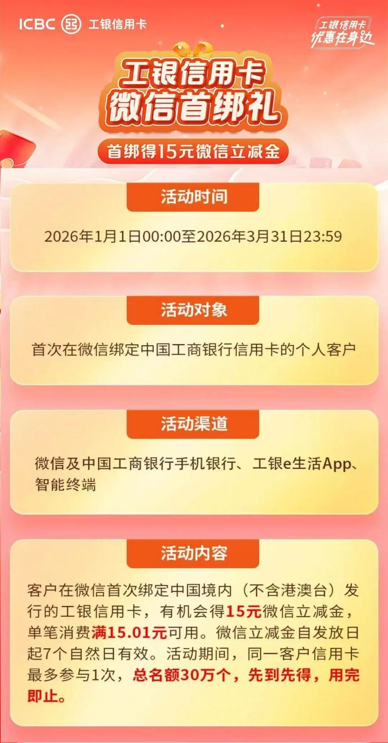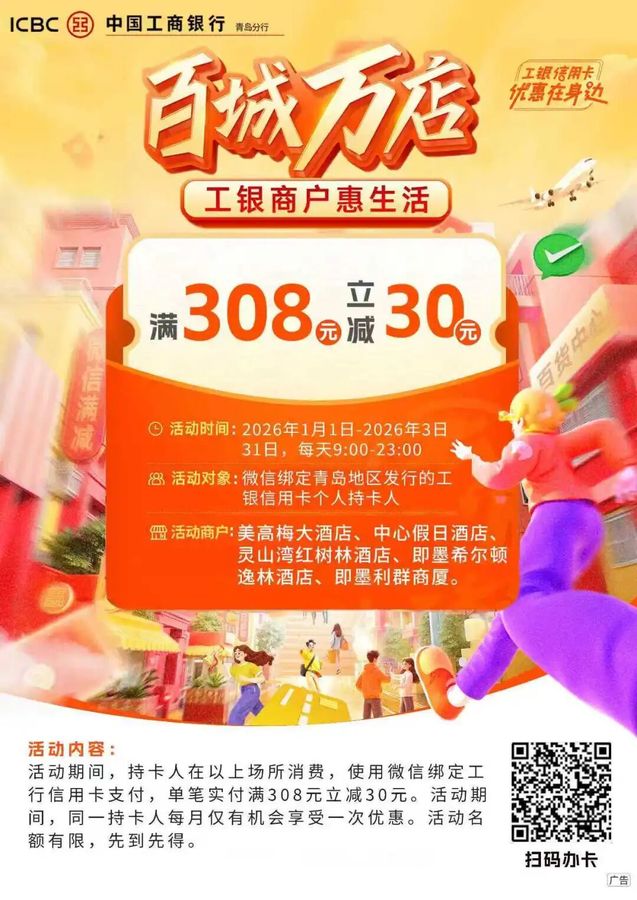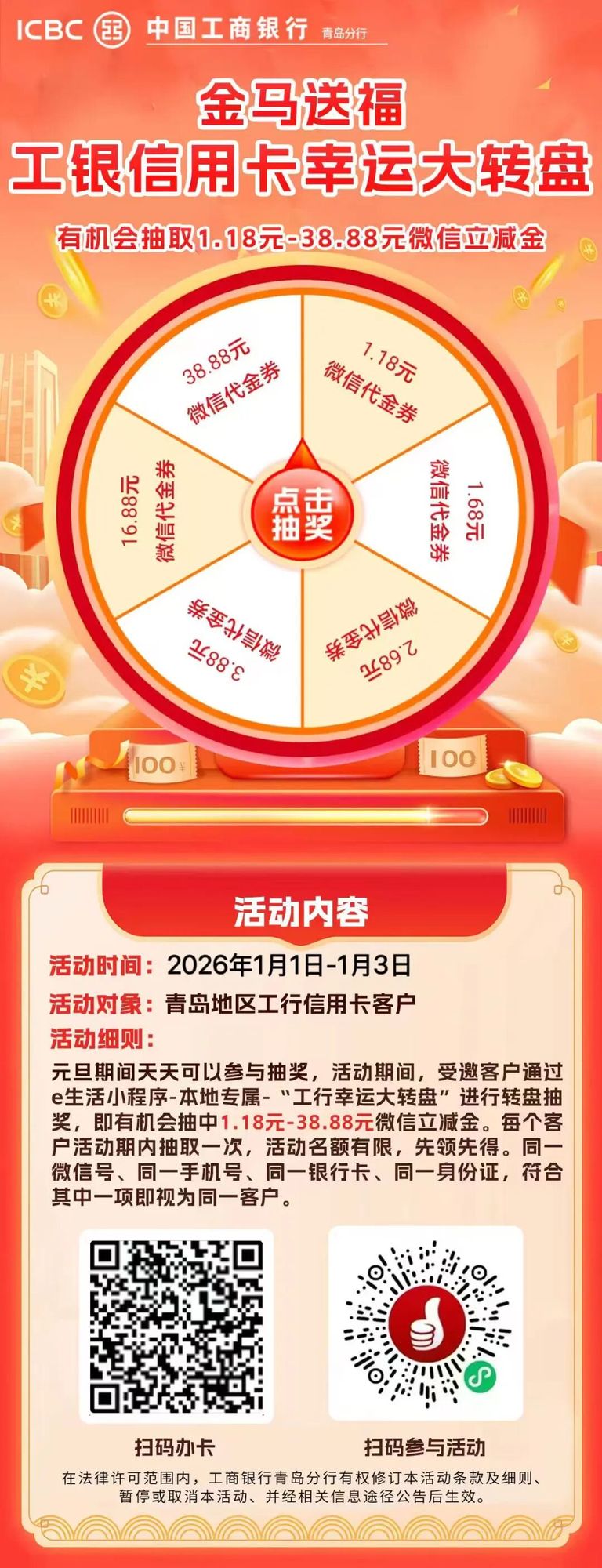 绑青岛工行信用卡享元旦福利 1、工银信用卡大转盘 元旦假期天天抽,最高能抽38.88元,每天都有机会抽奖! ![]() 2、工行百城万店消费立减 【百货购物省100】在海信广场、西海岸海信嘉年华逛百货,用微信绑的工行信用卡支付,满 1008 元直接立减 100 元!买年货、添新衣都能冲~ ![]() 【餐饮酒店省 30】去美高梅大酒店、中心假日酒店等指定场所消费,满 308 元立减 30 元!聚餐、度假都能省~ ![]() 3、首绑礼 首次在微信、支付宝绑定工行信用卡的用户可得15元立减金,快来领! ![]() ![]() 下一篇: 冯氏2026新年贺词