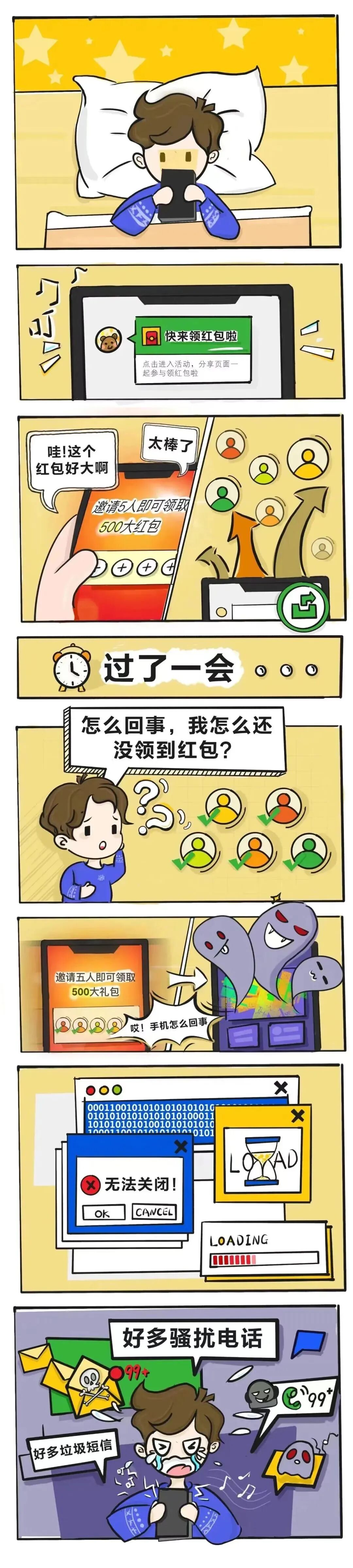 反诈防骗莫淡忘 上班不上当 近来各种套路陷阱层出不穷 小编为大家带来一组 反诈漫画 帮助大家提升防诈意识 了解那些常见的骗局套路 分享外链红包类诈骗 ![]() 警方提醒 这样的分享类红包大家都见过,但其实这类所谓的红包多为营销广告,其主要目的就是为了让你帮他免费传播。 实际上,即便你真的邀请满5人,也不一定能拿到红包,红包网站会以“邀请的用户不满足要求”、“系统错误”等理由来搪塞你。 更糟糕的是,不法分子直接在红包链接中放置木马病毒。一旦有人点击红包,页面自动跳转到赌博、低俗、色情等非法网站。泄露个人信息,导致骚扰信息不断。 不要轻易相信“免费领取”“大额红包”等虚假信息。如果遇到可疑的红包信息,要及时核实,不要轻易相信。 免费领取游戏皮肤类诈骗 ![]() 警方提醒 切勿轻信陌生人发来的“免费领取游戏皮肤、装备”等信息,不要随意扫描点击不明链接。尽量避免开通小额免密支付。这一功能虽然方便,但存在被盗刷和诈骗的风险。同时,建议设置银行卡的日度限额,以防止盗刷导致损失扩大。 假冒客服类诈骗 ![]() 警方提醒 不要采取向陌生人账户汇款的方式订票或买票;一切购票信息都以12306官方网站或官方手机app查看购票情况为准。购买车票一定要选择正规渠道,例如12306等官方购票网站,不盲目轻信所谓的“折扣票”、“低价票”。 个人信息透露类诈骗 ![]() 警方提醒 不点击来历不明的邮件、网址链接、文件等,不轻易向陌生网友透露个人信息。个人信息泄露是诈骗成功实施的关键因素,不法分子在精准掌握用户个人信息的前提下,能编造出迷惑性更高的诈骗场景,得以对公众实施欺诈。