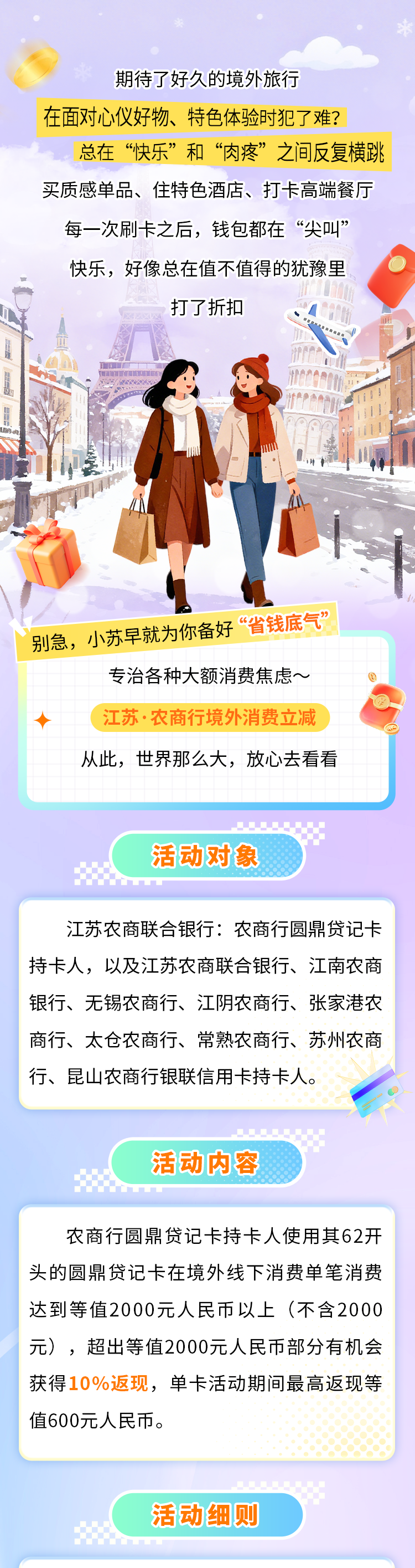 1.本活动无需报名,活动对象符合达标条件即有机会获得返现。 2.活动期间,农商行圆鼎贷记卡持卡人使用江苏农商联合银行指定62开头的银联卡在境外通过银联网络线下消费,才有机会享返现。 3. 境外返现参与条件为:参与活动的交易包含境外(含中国香港、中国澳门、中国台湾)通过银联网络的线下交易。境外取现、退税/退款以及通过支付宝、微信等第三方支付的境外交易不计入本活动境外交易统计范畴。货币转换汇率按银联汇率执行。 4.本活动所有时间点以中国银联后台系统时间(北京时间)为准。如出现不可抗力或情势变更等情况(如重大灾害事件、受有权机关指令需停止或调整的、系统故障需暂停的、活动中存在违规作弊行为损害消费者权益的),在法律许可的范围内,中国银联保留调整、暂停和终止本活动的权利,并经公告后生效。 5.若因商户未及时向银行请款结算或因卡组织或收单行的原因导致无法识别为境外交易,恕不计入活动统计。 6.本活动达标交易金额以银联系统入账的等值金额按照上述活动规则进行计算,汇率以交易日当天银联国际凯发k8娱乐官网app下载官网汇率为准,持卡人可在银联国际凯发k8娱乐官网app下载官网(https://www.unionpayintl.com/)帮助中心查询当日汇率。 7.本活动返现均以该笔交易银联系统中扣账币种进行。t 10日左右返现到账(t:交易达标日期)。 8.持卡人参与本活动应当遵守诚实信用原则,不得通过任何不正当手段或以违反诚实信用原则的方式套取返现优惠,对使用或涉嫌使用违反活动细则、规则或不正当方式套取返现优惠的持卡人,银联国际有权不予返现优惠、追回已发放的返现优惠,并拒绝其今后参加中国银联的任何优惠活动。具体违反诚实信用原则的行为包括但不限于: (1) 通过任何不正当手段或以违反诚实信用原则的方式参与活动的,如通过与收银员等他人串通或利用技术手段进行作弊、批量获取优惠权益等扰乱活动秩序的行为; (2)通过任何不正当手段或以违反诚实信用原则的方式达成交易的,如利用系统漏洞或通过技术手段伪造交易、虚假下单、提供虚假交易信息骗取优惠权益等扰乱交易秩序的行为; (3)同一用户违反活动规则控制和使用他人用户信息(例如,非本人银行卡信息)参与营销活动,套取优惠权益等扰乱交易秩序的行为; (4)其他违反诚实信用原则的行为。 9.持卡人如发生退货、退税、冲正或撤销等交易,将不进行返现,且中国银联及活动银行保留扣回不符合条件但已返现金额的权利;如发现有利用活动规则恶意套取返现奖励的持卡人,中国银联及活动银行保留取消其继续参加返现活动的权利。 10.本活动由银联国际开展。但银联国际不是商品和/或服务的提供方,不对商品和/或服务本身承担任何责任。 11.持卡人参与本活动即视为理解并同意本活动条款及细则。在法律允许范围内,中国银联保留变更、调整、终止该活动的权利。如有疑问,可咨询中国银联客服电话:95516。 (上下滑动查看活动) ![]()