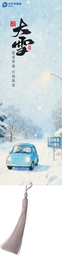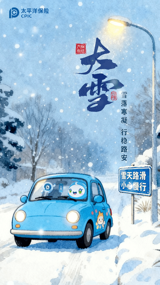 ![]() 亲爱的朋友, 今日大雪,仲冬已至!北方小伙伴们的朋友圈都被雪景刷屏了吧?近期内蒙古、东北多地正经历“断崖式降温”,黑龙江漠河跌破-30℃,吉林、长白山风雪交加,部分路段积雪超半米,在极寒与暴雪中,行车安全也牵动着我们的心。 特别提醒广大司机朋友,冰雪天开车出门务必打起十二分的精神,出发前记得给爱车穿“暖衣”:检查防冻液是否充足,轮胎换上防滑链或雪地胎,确保刹车系统灵敏。 行车路上减速慢行,保持平时2倍以上的车距,避免急刹或猛打方向盘。遇到结冰路段,轻柔操作方向盘,低挡位缓慢通过。 如需要帮助,可拨打中国太平洋保险全国统一客服热线95500,我们提供“责任、智慧、温度”的太保服务。 雪落寒凝 行稳路安 中国太保 陪你稳稳驶过 每一程风雪 ![]()