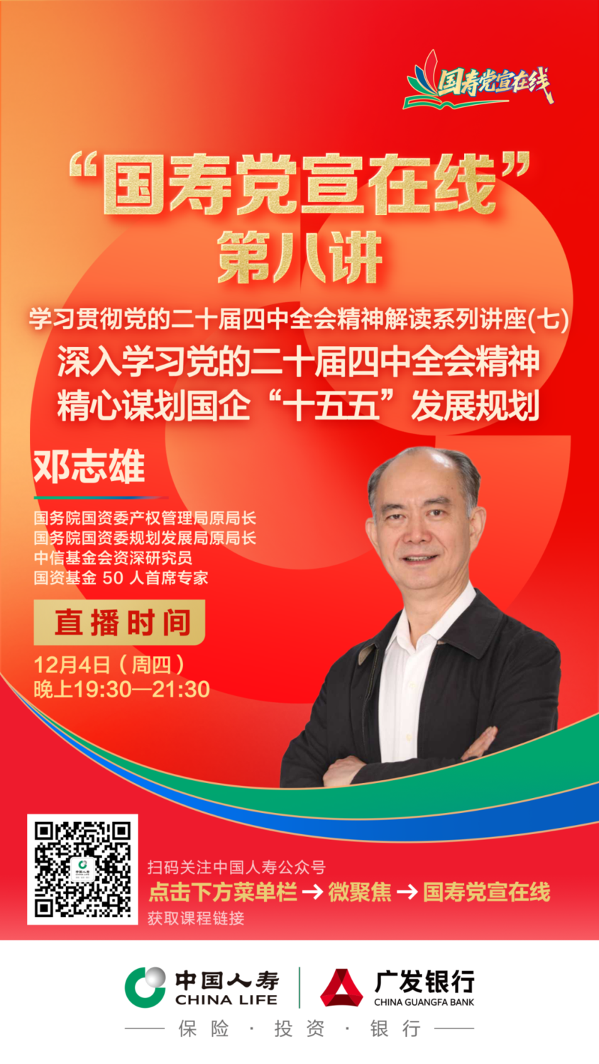 ![]() 2025年10月起,中国人寿集团面向系统各级党组织和党员推出“国寿党宣在线”系列线上直播课程。课程内容紧跟时政热点,涵盖党建、经济、管理、科技、文化素养等领域,由各知名院校和专家智库联合呈现。 为深入学习贯彻党的二十届四中全会精神,“国寿党宣在线”12月4日将推出第八讲线上直播课程,由国务院国资委产权管理局原局长、国务院国资委规划发展局原局长、中信基金会资深研究员、国资基金50人首席专家邓志雄讲授学习贯彻党的二十届四中全会精神解读系列讲座(七)——深入学习党的二十届四中全会精神,精心谋划国企“十五五”发展规划,欢迎广大干部员工观看、学习。 ![]() 【直播时间】 12月4日 19:30 【参与方式】 识别海报二维码 关注中国人寿公众号 点击下方菜单栏 ⇓ 微聚焦 ⇓ 国寿党宣在线 获取课程链接 课程专栏面向中国人寿系统内部使用,首次登录需要输入密码,后续无需再输入密码即可直接进入专栏学习。 在专栏内点击“目录”即可看到所有课程链接,最新课程将在最上方显示。 上一篇: 今日大雪|寒冬有期 暖意常伴