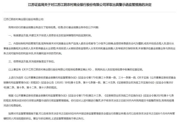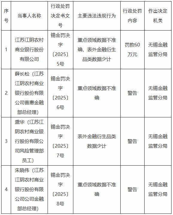 1月5日,国家金融监督管理总局苏州监管分局披露的行政处罚信息公开表显示,江苏江阴农村商业银行股份有限公司苏州分行因票据业务审核不严被罚款50万元,并没收违法所得21284.75元。 同时,相关责任人顾冬青(江阴农商行苏州分行普惠金融部总经理)被警告并处罚款6万元。 ![]() 值得注意的是,该行总行此前也因不同问题受到监管部门关注。 2025年6月27日,江苏证监局发布公告称,对江苏江阴农村商业银行采取出具警示函的行政监督管理措施。 公告显示,江苏江阴农村商业银行的基金销售业务主要存在三项问题:一是制度建设方面,未建立关于投资人信息安全及权益保障等的风险监测机制。二是内部控制和风险管理方面,现有制度未对代销基金业务产品准入委员会或者专门小组予以明确,由授信审查委员会代为履职,成员未包括合规人员;部分从事基金销售相关业务的人员未取得基金从业资格;未将投资人长期投资收益等纳入分支机构和基金销售人员考核评价指标体系;未审慎评估基金销售业务与其他业务之间可能存在的利益冲突,并完善利益冲突防范机制。三是信息报送方面,反洗钱报备落实不到位。 ![]() 2025年4月28日,据国家金融监督管理总局无锡监管分局行政处罚信息公开表,江苏江阴农村商业银行股份有限公司因重点领域数据不准确、表外金融衍生品类数据少计,被罚款60万元。 ![]() 据公司凯发k8娱乐官网app下载官网介绍,江阴农商银行前身江阴市信用合作社联合社,是在原江阴市35家法人信用合作社和3家城市信用社的基础上,经国务院、中国人民银行总行批准,由江阴企业、自然人入股组建的地方性股份制商业银行,是全国首批三家股份制农村商业银行之一。 2025年前三季度,公司实现营业总收入32.04亿元,同比增长6.17%;归母净利润12.78亿元,同比增长13.38%;扣非净利润12.29亿元,同比增长14.94%;经营活动产生的现金流量净额为-34.11亿元,上年同期为38.34亿元;报告期内,江阴银行基本每股收益为0.5194元,加权平均净资产收益率为6.79%。 此外,2025年12月30日,江阴银行披露核心人事变动进展。公告显示,国家金融监督管理总局无锡监管分局已正式核准耿轶韬职工董事、郁晓芸副行长的任职资格。