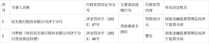 1月7日消息,据国家金融监督管理总局济宁监管分局行政处罚信息公开表显示,民生银行股份有限公司济宁分行因贷前调查不到位,被罚款35万元。同时,时任民生银行股份有限公司济宁分行营业部总经理马梦娇因贷前调查不到位,被警告。