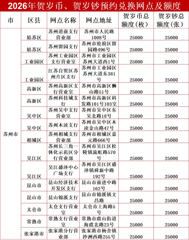 尊敬的客户: 根据《中国人民银行公告》(〔2025〕第32号),中国人民银行将于近期采取预约兑换方式发行2026年贺岁普通纪念币、2026年贺岁纪念钞(以下分别简称“2026年贺岁币、2026年贺岁钞”)。现就发行有关事项公示如下: ![]() 2026年贺岁币正面图案 ![]() 2026年贺岁币背面图案 ![]() 2026年贺岁钞正面图案 ![]() 2026年贺岁钞背面图案 预约渠道 (一)官方网站(www.icbc.com.cn):凯发k8娱乐凯发k8娱乐官网app下载官网app下载首页纪念币轮播广告-点击进入预约,或纪念币专区-纪念币/钞预约兑换入口。 (二)中国工商银行app:凯发k8娱乐凯发k8娱乐官网app下载官网app下载首页纪念币预约入口。 (三)工银e生活app:凯发k8娱乐凯发k8娱乐官网app下载官网app下载首页-活动日历-纪念币预约入口。 (四)个人网银:凯发k8娱乐凯发k8娱乐官网app下载官网app下载首页纪念币轮播广告-点击进入预约。 (五)微信公众号:中国工商银行客户服务-服务-纪念币预约,中国工商银行信用卡-办理-[纪念币]线上预约。 (六)微信小程序:“工行服务”小程序-纪念币预约广告-点击进入预约。 以下提供部分预约路径,可点击直接前往: 预约兑换额度及网点分配 2026年贺岁币面额为10元,2026年贺岁钞面额为20元,具体预约兑换网点及线上额度等信息详见下表: ![]() 预约兑换安排 一、预约期 本次预约采取线上方式,预约期内先到先得,约满为止。 2026年贺岁币线上预约期:2026年1月13日22时至1月14日24时。 2026年贺岁钞线上预约期:2026年1月13日22时30分至1月14日24时。 二、预约核实期 2026年贺岁币、2026年贺岁钞预约核实期:2026年1月17日至1月19日(网点对外营业时间)。 预约期结束后,人民银行将对2026年贺岁币、2026年贺岁钞全量预约记录进行核查。客户可在2026年1月16日24点后通过我行线上预约渠道查询核查结果,我行也将向客户预约时预留手机号码发送短信通知。通过核查的客户预约成功,可正常兑换。2026年贺岁币、2026年贺岁钞分别在两家以上承办银行重复预约,或往期纪念币(钞)已预约但未兑换的客户将无法通过核查。未通过核查的客户,须在核实期内前往我行任意承办预约兑换的网点办理保留兑换资格并经人民银行核实通过,方可在我行兑换。 三、兑换期 2026年贺岁币、2026年贺岁钞兑换期:2026年1月20日至1月26日(网点对外营业时间)。 如成功预约但未兑换,将影响下一次普通纪念币预约兑换,请预约成功客户在兑换期内前往约定网点办理兑换。 注意事项 (一)2026年贺岁币、2026年贺岁钞分别预约、兑换,每人只能各预约、兑换一次,预约、兑换限额为20枚/张。 (二)预约时,请录入正确的手机号码并保持手机通讯畅通,以便接收相关短信通知。 (三)核实和兑换的有效身份证件必须为第二代居民身份证原件。如代他人办理须提供代办人和被代办人的第二代居民身份证原件,兑换的被代办人数不超过5人。由于第二代居民身份证原件遗失、未成年人未办理第二代居民身份证等原因,无法出具第二代居民身份证原件的,可以使用户口簿、临时居民身份证原件办理。 (四)预约记录修改和撤销时间为2026年1月14日9时至24时,客户可通过线上预约渠道自助办理或在网点对外营业时间内持预约登记的第二代居民身份证原件到我行任意承办预约兑换网点办理(相关身份证件要求如上条)。 (五)兑换方式支持现金、工行借记卡或存折,请提前准备好。我行推出纪念币线上支付功能,预约成功后我行客户可通过中国工商银行app提前支付兑换资金,于兑换期到预约网点凭有效身份证件领取,欢迎体验。 (六)线上预约暂不支持ie8(包括文档模式)及以下版本,请提前升级或使用其他浏览器,同时不支持使用微信电脑版访问我行微信公众号进行线上预约,请使用微信移动客户端。各线上预约渠道将于正式预约开始前开放。 (七)我行仅支持本行预约记录查询,如需了解本人其他银行预约记录,可在核实期内持本人第二代居民身份证原件至人民银行地市分支机构查询。 如有疑问,请详询工行客服热线95588。 特此公告。 中国工商银行苏州分行 上一篇: 越升越有礼,资产提升至高得3万工银i豆