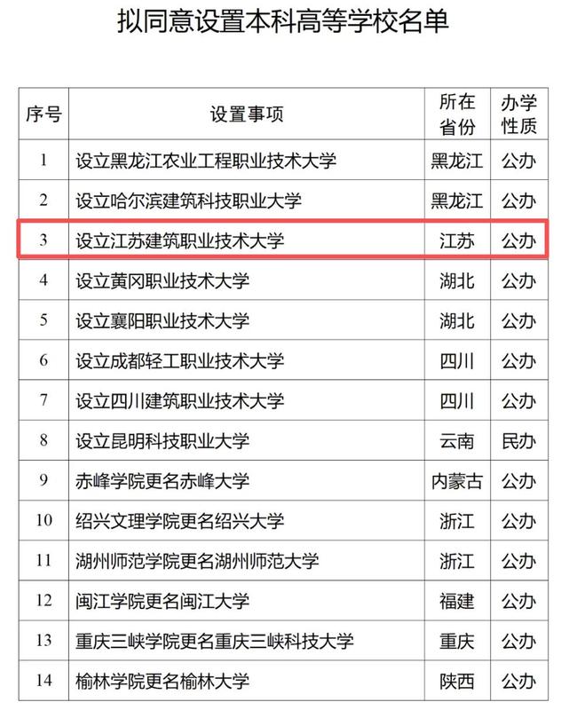 1月12日,教育部发展规划司发布《关于拟同意设置本科高等学校的公示》,拟同意设置14所本科高等学校。其中,江苏建筑职业技术学院拟升格为公办本科高等学校——江苏建筑职业技术大学,成为江苏省又一所公办本科大学。