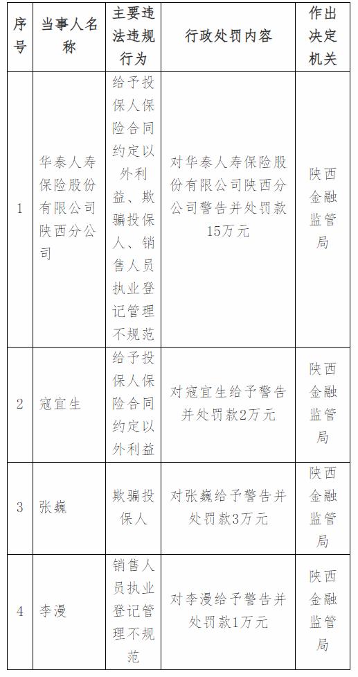 近日,国家金融监督管理总局陕西监管局公布行政处罚信息显示,华泰人寿保险股份有限公司陕西分公司及其三名相关责任人因存在“给予投保人保险合同约定以外利益”、“欺骗投保人”和“销售人员执业登记管理不规范”三项违法违规行为,被处以警告及罚款。 其中,华泰人寿陕西分公司被警告并罚款15万元;责任人寇宜生因涉及给予合同外利益被警告并罚款2万元,张巍因欺骗投保人被警告并罚款3万元,李漫因执业登记管理不规范被警告并罚款1万元,合计被罚21万元。