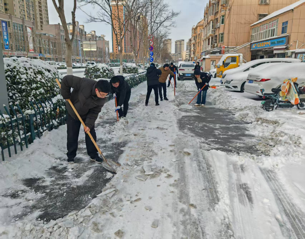 活动现场,支行领导班子成员带头冲锋,带领志愿者们手持铁锹、扫帚等工具,迅速划分责任区域,形成“分工协作、高效推进”的扫雪格局。大家不畏严寒、干劲十足,有的弯腰挥动扫帚,细致清扫路面浮雪;有的奋力挥舞铁锹,重点铲除人行道、路口等关键点位的压实积雪和冰层;有的主动疏导过往行人车辆,提醒出行安全。凛冽寒风中,志愿者们的身影忙碌而坚定,汗水渐渐浸湿衣领,却丝毫没有减退服务热情,他们用实干在白雪皑皑的路面上勾勒出一道靓丽的“金融暖心风景线”。