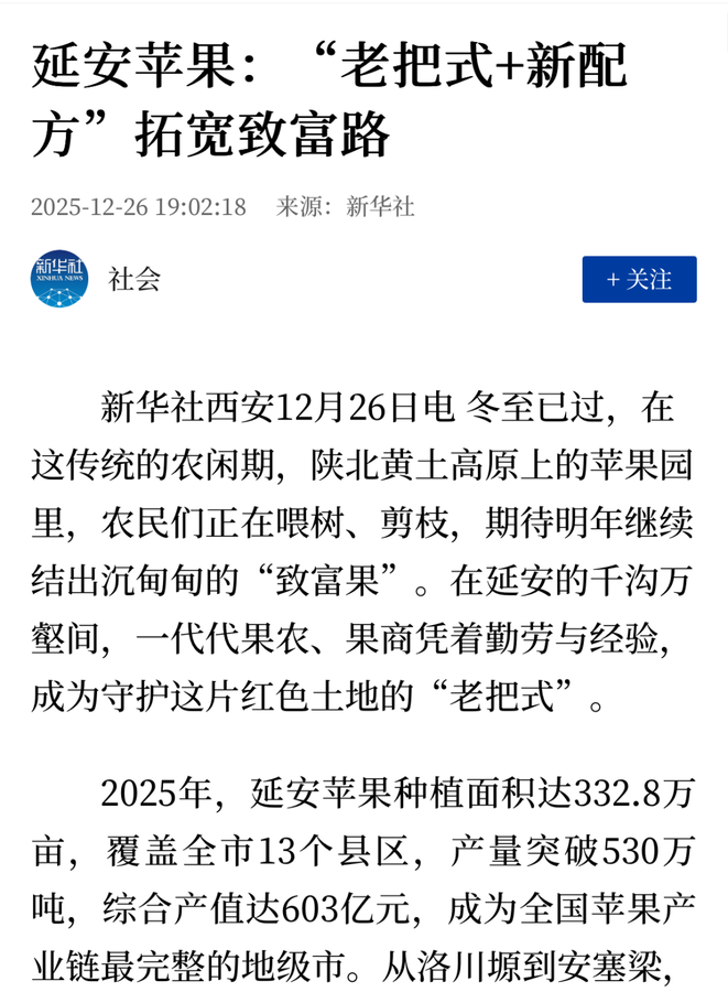 最近 人民日报头版和新华社 同时聚焦延安苹果 但没有想到 故事的另一个主角 竟是我们邮储银行 ![]() ![]() 一次特别的“点名” 当一颗苹果,不仅甜蜜,还承载着一条完整的产业链和无数家庭的致富梦时,它的故事就值得被记录。 ![]() 新华社以细腻笔触,描绘了 “老把式 新配方” 的产业变革。 人民日报则在头版位置,将其置于夯实中国式现代化“三农”底座的宏大叙事中。 而在两大央媒讲述的故事里,邮储银行都成了一个被清晰“@”的关键角色。 到底咋回事? 事情是这样的…… 在延安的千沟万壑间,332.8万亩苹果园正结出“致富果”。 ![]() 这里有90后新农人刘延利这样的“新把式”,通过短视频帮乡亲卖出20多万斤苹果,却也在扩大规模时,为资金周转发愁。 “冷库合同要签了,钱还没凑齐。” ——这不仅是刘延利的难题,也是许多果农发展的真实瓶颈。 这时,邮储银行延安市分行的“苹果信用产业贷”带来了转机: 3天时间,200万元贷款到账! 刘延利说:“有了金融机构加持,陕北苹果一定会红遍全国、香遍全球。” 我们为什么会被“@” 金融不只是数字,更是温度。在延安,我们做的不仅是资金支持,而是一套系统性的陪伴。 整村授信,让好信用变成“硬通货” 产业贷,贯穿种、储、销、深加工全链 政银协同,让农户获得全流程“服务” ![]() 截至2025年11月,邮储银行已向延安苹果产业链投放贷款超38.5亿元,服务近万户果农和商户。 每一次金融服务背后,都是一个家庭的生计。一个产业的升级,一个乡村的全面振兴! 如果说央媒点赞的是“果” 那么我们专注的是“树”与“人” 人民日报和新华社关注的是乡村全面振兴的成果,是产业崛起的路径。而邮储银行每天在做的,是走进果园、冷库、电商直播间;是回应一个个具体而微的金融需求;是把专业服务落到每一寸需要生长的土地上。 感谢这份来自顶流媒体的“点名”。它让我们看见金融的温度,可以被看见;乡村的梦想,值得被记录。 ![]() 一颗苹果,连接黄土与云端;一份担当,融合金融与梦想。在广袤的乡村大地上,奋进的力量正在激荡! 邮储银行 愿继续做那束照亮前路的光 下一篇: 节气︱小寒