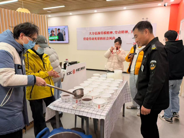 为深入弘扬中华优秀传统美德,切实将节庆文化与关怀服务深度融合,1月26日,工商银行苏州道前支行联合苏州市总工会户外劳动者服务总站,共同开展“腊八送暖·工行有爱”主题公益活动,为外卖骑手、快递员等新就业形态劳动者送上节日问候与温馨服务,传递出浓浓的节日温情与社会关怀。 寒冬腊月暖粥香,公益同行显担当 活动现场暖意融融、氛围热烈,该行与总工会工作人员提前精心布置场地,将热气腾腾的爱心腊八粥整齐摆放。一碗碗寓意着“五谷丰登、幸福安康”的腊八粥,不仅驱散了户外劳动者的冬日寒意,更让他们感受到来自社会各界的真切关怀。“平时奔波忙碌,很少能停下来喝上一口热粥,我们这心里呀暖洋洋的!”一位快递小哥在接过腊八粥时笑着说道。