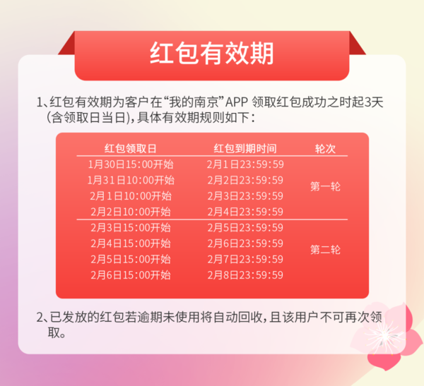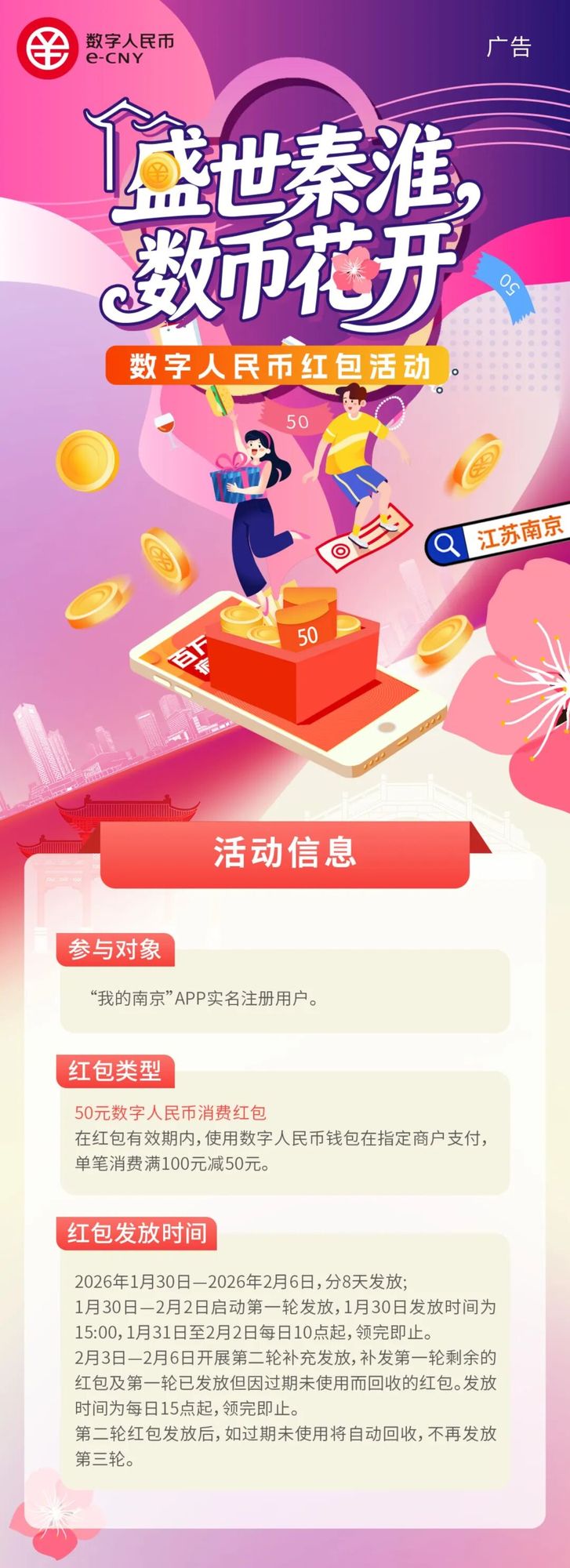 ![]() 红包数量 本次活动共计发放21700个红包 由8家数字人民币运营机构银行共同提供 ![]() *每日红包发放均为先到先得,领完即止。 红包领取方式 1、登录“我的南京”app并完成实名认证。 2、进入方式:点击“我的南京”app凯发k8娱乐凯发k8娱乐官网app下载官网app下载首页的【宁享消费】进入活动页面,或通过凯发k8娱乐凯发k8娱乐官网app下载官网app下载首页活动宣传banner图进入活动页面。 红包查询方式 1、用户领取红包后,系统自动将红包发放至与“我的南京”app实名注册手机号对应的运营机构数字人民币个人钱包。 2、红包发放时间可能略有延迟,领取用户可至“数字人民币”app服务-消费红包中查看已领取的红包。 温馨提示:同一用户(同一手机号或同一身份证件号)在整个活动期间仅可领取一次红包。 红包使用规则 1、红包仅限在南京中央商场新街口店、南京新百中心店、南京金鹰新街口店、jlc金陵中环4家商场的千余家指定商户使用,用户可在“我的南京”app活动页面中详细查看具体红包可用商户清单。 2、在红包有效期内,用户可前往指定商户消费,当消费金额满100元且通过该红包对应运营机构的数字人民币钱包支付时,可使用此红包抵扣50元。红包不可拆分使用。 3、红包仅限本人使用,不可转让给他人,不可兑回至本人银行账户。 4、用户在活动指定商户以数字人民币方式付款时,红包抵扣后的剩余付款金额,需用个人数币钱包或绑定银行账户内的余额补足。 红包有效期 ![]() 退款规则 1、若用户在数字人民币红包使用有效期内取消订单或退货,系统将自动退还数字人民币红包,退还的数字人民币红包有效期与原红包一致。 2、若用户在数字人民币红包使用有效 温馨提示 1、未开立相关运营机构个人数字钱包的用户,须在红包领取后且在红包有效期内根据指引下载数字人民币app,并完成个人数字钱包的开立。 2、已开立“数字人民币”app钱包的用户应确保参与活动的钱包处于正常状态,若为异常状态,应在红包有效期内联系各银行处理。 3、用户应确保下载、注册“数字人民币”app的手机号与“我的南京”app注册及参加活动手机号完全一致。 4、虚拟手机号码用户不能参加此次活动。(虚拟手机号开头为162、165、167、171、174、192、1700、1701、1702、1703、1704、1705、1706、1707、1708、1709、1349) 5、参与活动的商户须严格遵守活动规则,不得借机抬高商品价格、撤下畅销商品、搭售滞销商品,或实施其他侵犯消费者权益的行为。 6、若发现消费者或商户存在刷单、套现、抬价后接受消费红包等虚假消费行为,将立即取消其参与资格。同时,将收回消费者已获得的优惠或商户已获得的补贴,并对失信行为进行记录。情节严重者,将列入不诚信名单并予以公开曝光。 (上下滑动查看更多) 服务咨询热线 1、“我的南京”app注册及红包领取问题咨询“我的南京”app 服务热线:025-56665079 2、交通银行钱包问题请咨询:95559 3、商户相关问题请咨询各商场: 南京中央商场新街口店:025-84718288 南京新百中心店:025-84761777 南京金鹰新街口店:025-84708899 jlc金陵中环:025-86896611 活动组织单位 主办单位: 南京市秦淮区人民政府 承办单位: 秦淮区发改委 秦淮区商务局 南京新街口金融商务区管理委员会 协办单位: 中国工商银行南京分行 中国农业银行南京分行 中国银行南京分行 中国建设银行南京分行 交通银行江苏省分行 中国邮政储蓄银行南京市分行 招商银行南京分行 兴业银行南京分行 南京中央商场新街口店 南京新百中心店 南京金鹰新街口店 jlc金陵中环 凯发k8娱乐官网app下载的技术支持: 银联商务江苏分公司、南京大数据集团