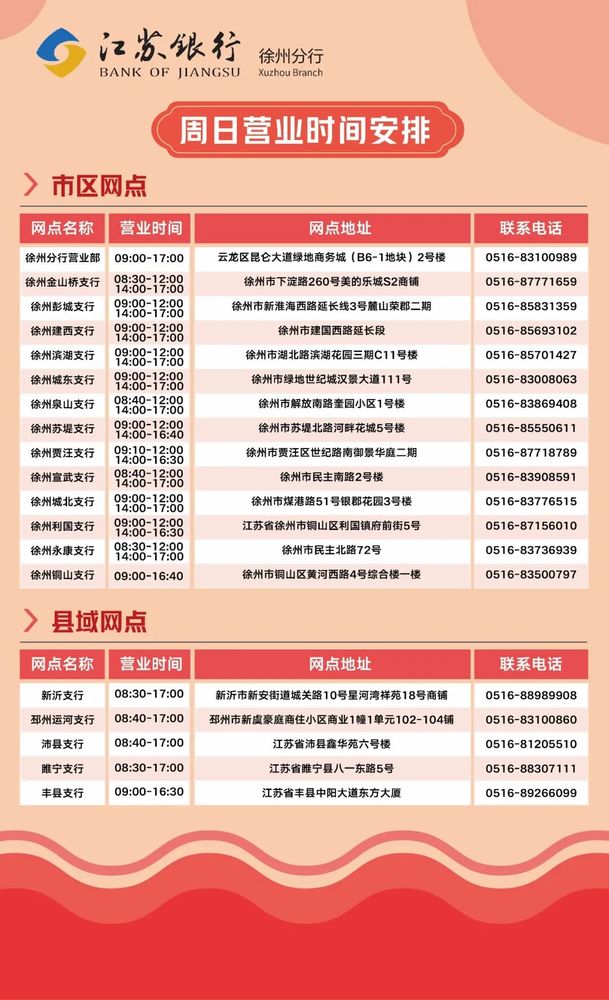 周末网点营业时间表 2026 江苏银行徐州分行 ![]() ![]() 温馨提示 您还可通过我行手机银行、网上银行、官微等电子渠道随时享受便捷服务。如有问题,可致电24小时客服热线95319咨询。 感谢您的理解与支持! ![]() 上一篇: 江苏银行徐州新城区支行迁址及更名公告