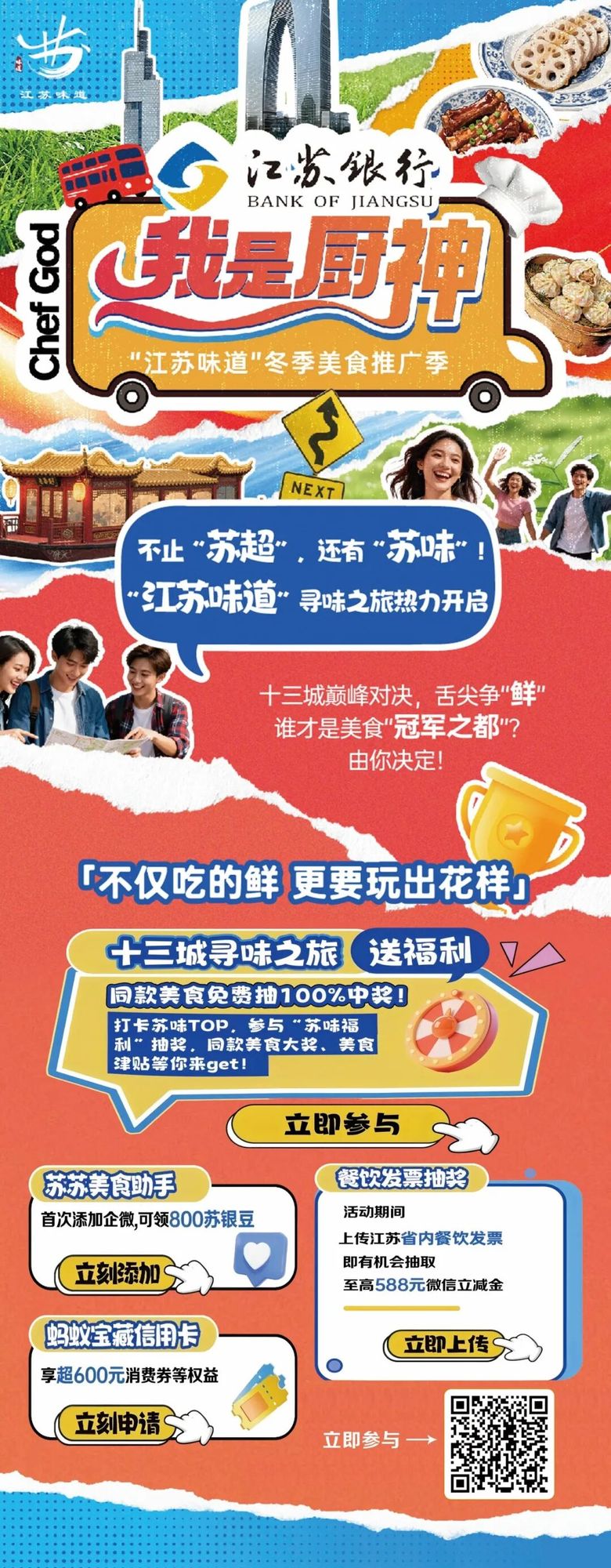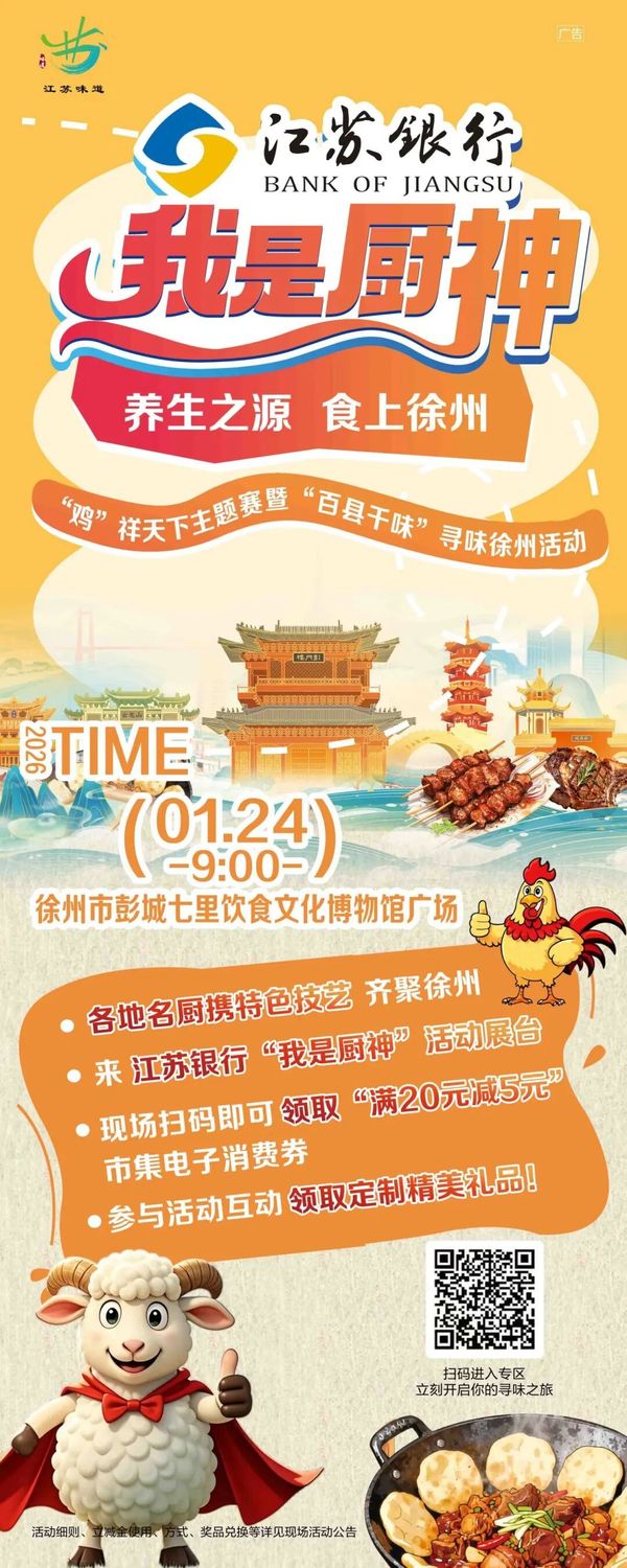 “不止苏超,还有苏味” 江苏银行“我是厨神”活动来啦! 徐州分行邀您共赴舌尖上的盛宴! ![]() 1月24日(本周六)09:00 徐州彭城七里饮食文化博物馆 “鸡”祥天下主题赛 寻味市集启幕 名厨齐聚秀技艺! 好礼来袭 现场参与互动可领取“满20减5微信立减金”或定制好礼,首次添加企微可得800苏银豆,上传餐饮发票可抽最高588元立减金,申请蚂蚁宝藏信用卡享超600元消费券权益…… 舌尖寻味,周六相见! ![]() 上一篇: 官宣!江苏银行连续两届“苏超”总冠名